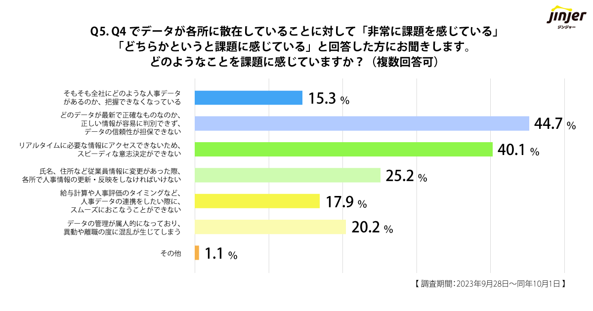 次に多かった回答は「リアルタイムに必要な情報にアクセスできないため、スピーディな意志決定ができない(40.1%)」、「氏名、住所など従業員情報に変更があった際、各所で人事情報の更新・反映をしなければいけない(25.2%)」と、人事データが最新化されていないことが、さまざまな業務を滞らせる原因となっているようです。