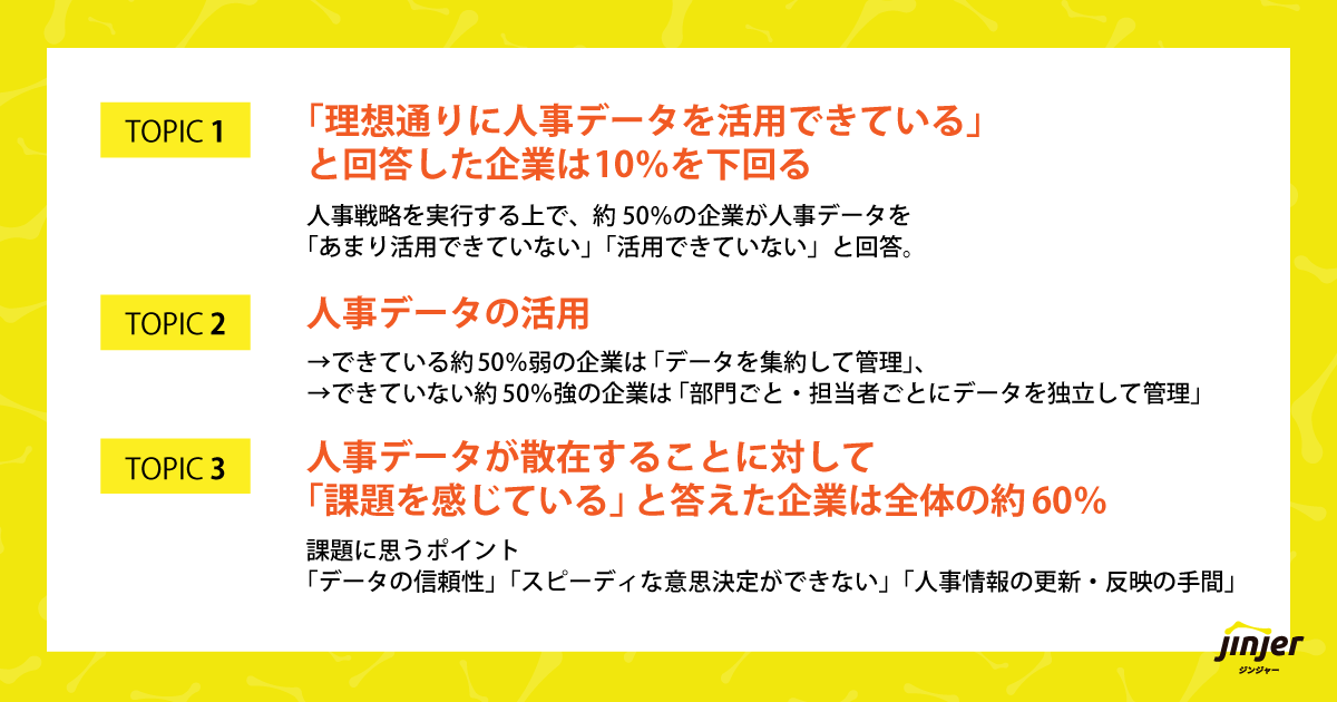 上記から、人事データを活用できている企業と、人事データを活用できていない企業の間には、人事データの持ち方に違いが生じる傾向がありそうです。