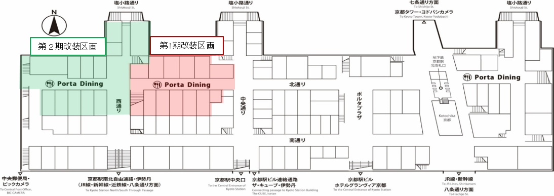 ■ポルタの飲食店ポルタの飲食店(レストラン、カフェ)は、地下鉄京都駅改札口より西側の西エリアに27店舗、同じく東側の東エリアに8店舗の計35店舗があり、これらを総称して「ポルタダイニング」と呼んでいます。今回のリニューアルは、これら「ポルタダイニング」35店舗のうち、西エリアの飲食店ゾーンにある24店舗が対象となります。