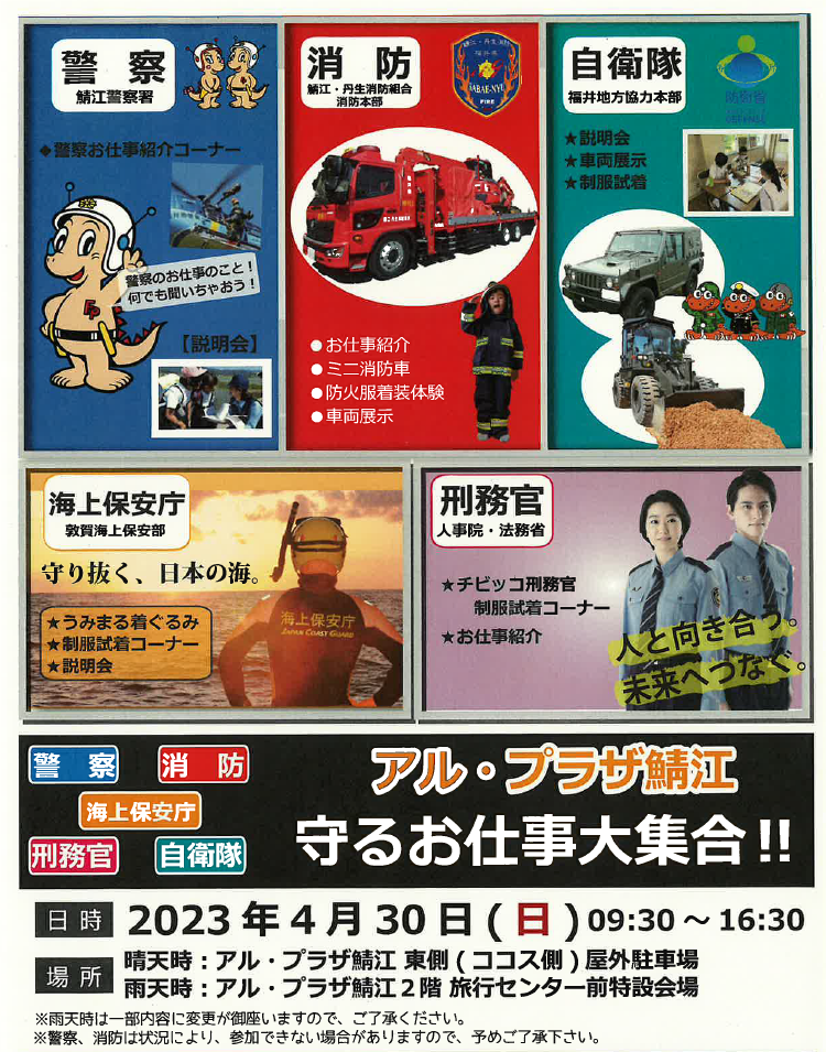 当日は特設会場において、警察(鯖江警察署)によるお仕事紹介、消防(鯖江・丹生消防組合消防本部)による車両展示や防火服着装体験、自衛隊(福井地方協力本部)による車両展示や制服試着、海上保安庁(敦賀海上保安部)による着ぐるみキャラクターや制服試着、刑務官(人事院・法務省)によるお仕事紹介やチビッコ刑務官制服試着等を行います。