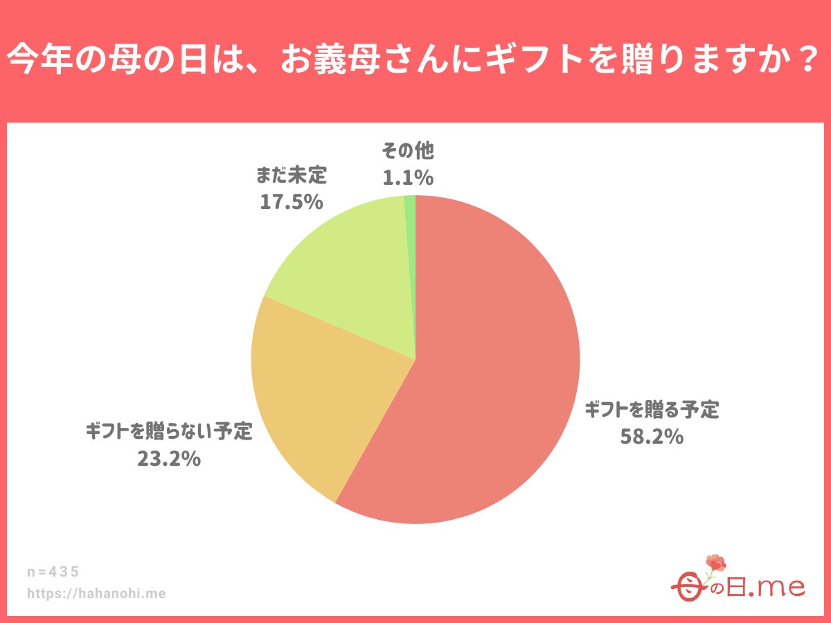 また、義母にもギフトを贈りますか?というアンケートの結果、義母へも母の日ギフトを贈る予定の人が過半数を占めていました。「ギフトを贈る予定」と答えた人が58.2%と過半数に達しており、多くの人が義母にも感謝の気持ちを伝える機会として母の日を意識していることが伺えます。