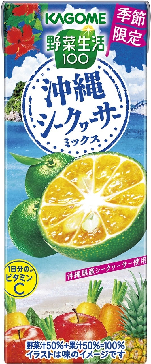 「野菜生活100 沖縄シークヮーサーミックス」は、さわやかな酸味と渋みのアクセントが特徴の沖縄県産シークヮーサーの味わいに仕上げた野菜・果実100%ミックスジュースです。朝食のおともやリフレッシュしたいときにおすすめです。パッケージには、沖縄県の瀬底島の砂浜をデザインしています。