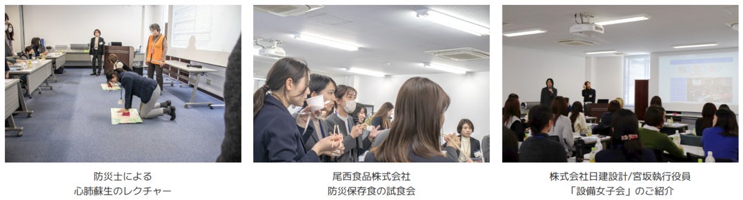 また、⽇本防災⼠会千葉県⽀部のご協力による心肺蘇生法の体験、「⼥性が考えるトイレ問題」についてのトークディスカッション、防災保存食の試食と、当日参加いただきました株式会社⽇建設計の宮坂執⾏役員より「設備⼥⼦会」のご紹介もいただき、盛りだくさんのセミナーとなりました。
