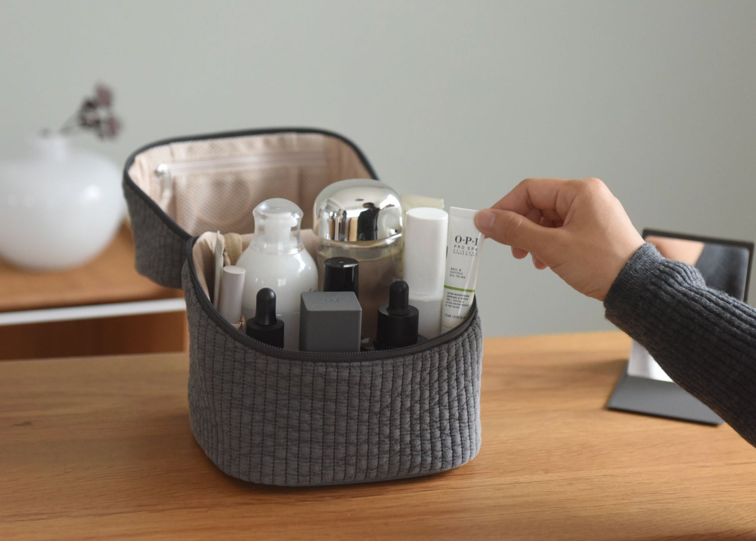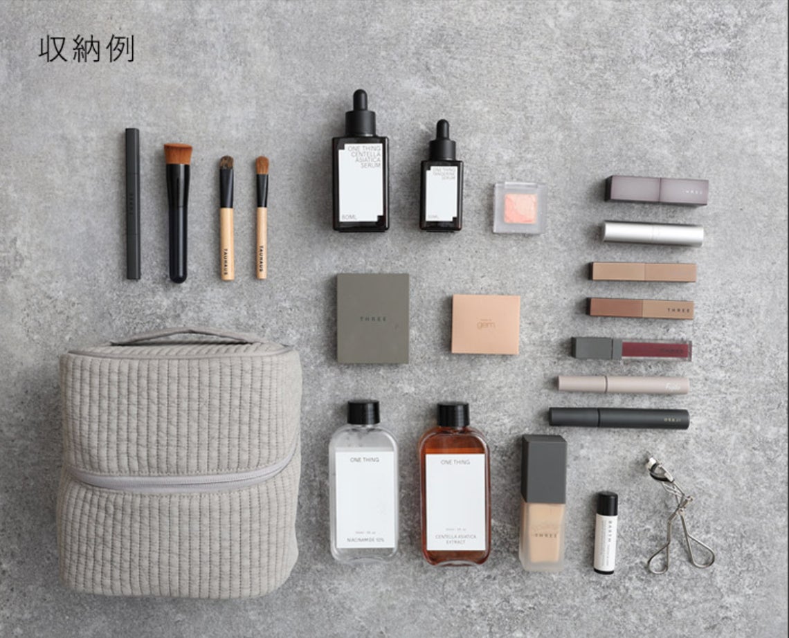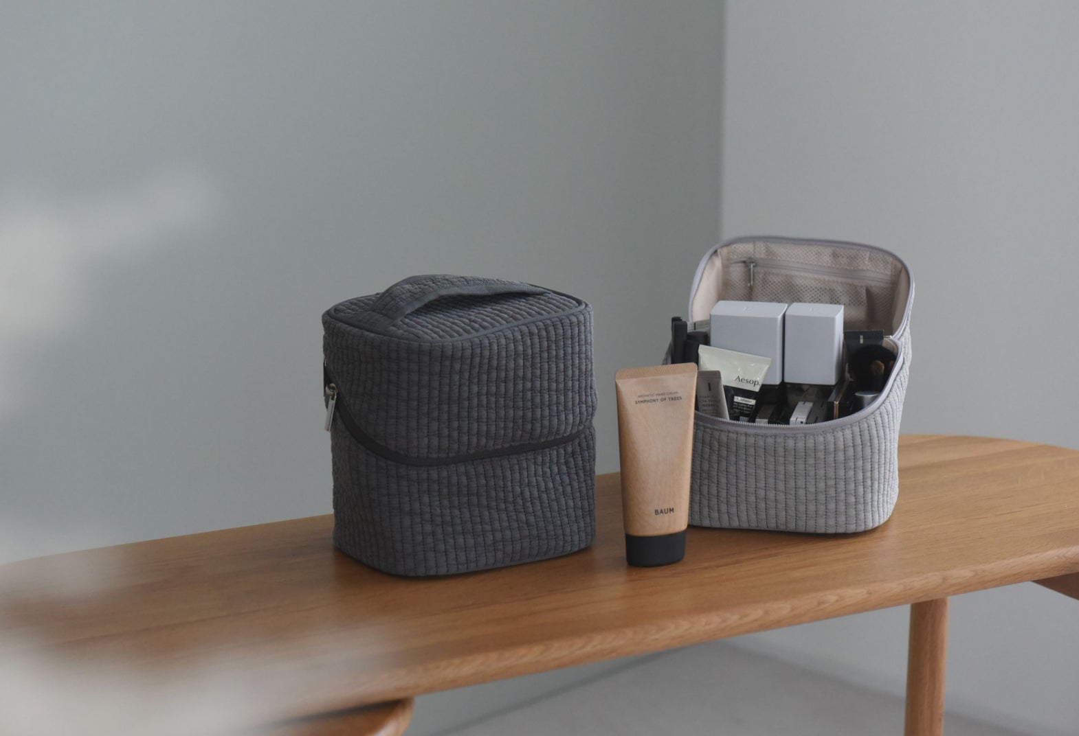 コスメはもちろん背の高い化粧水ボトルもすっぽり入る、収納力の高さが好評の bon moment(ボンモマン)バニティポーチ。収納力はそのままに、ヌビ(キルティング)素材のNEWモデルが登場します。