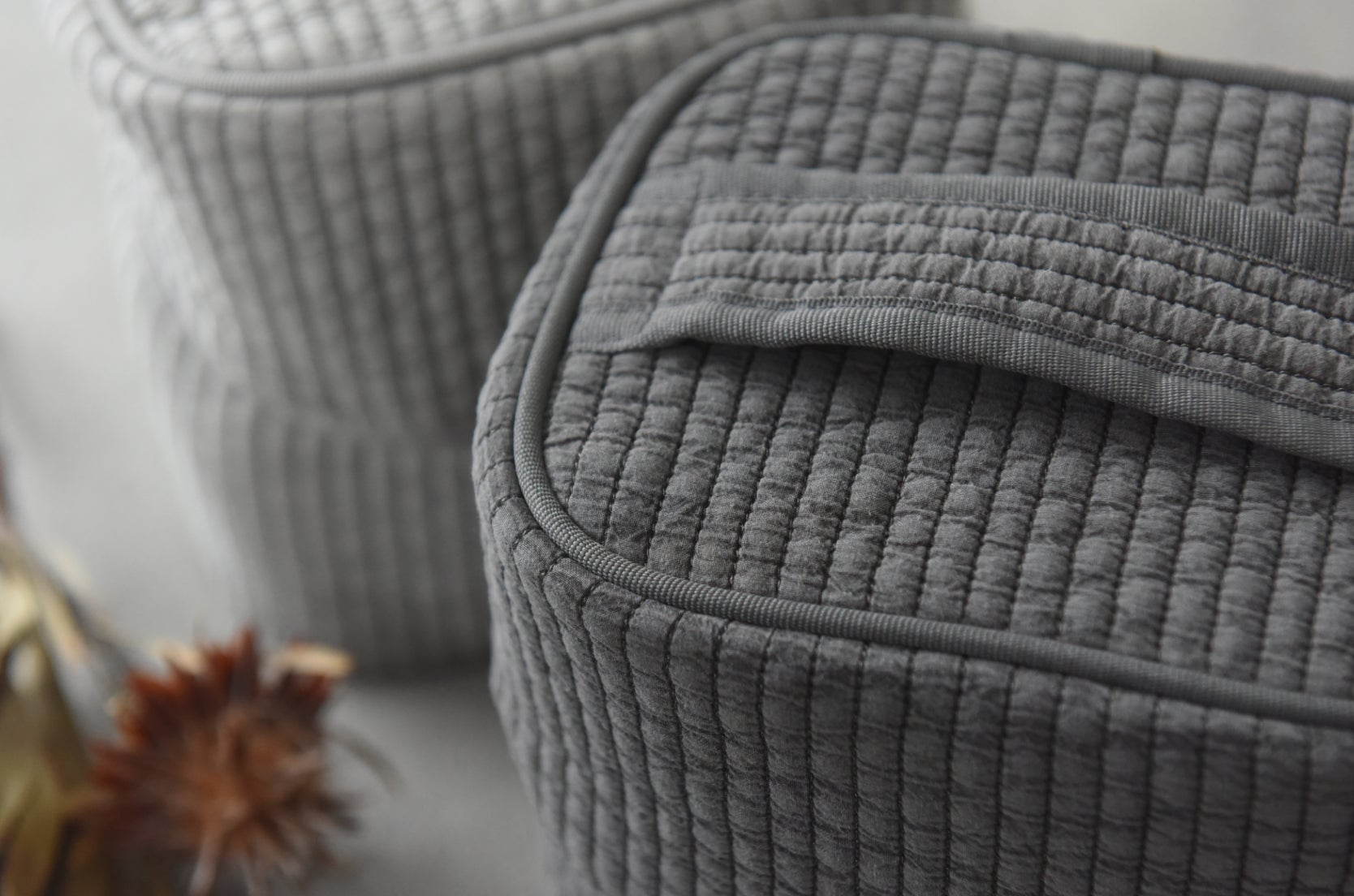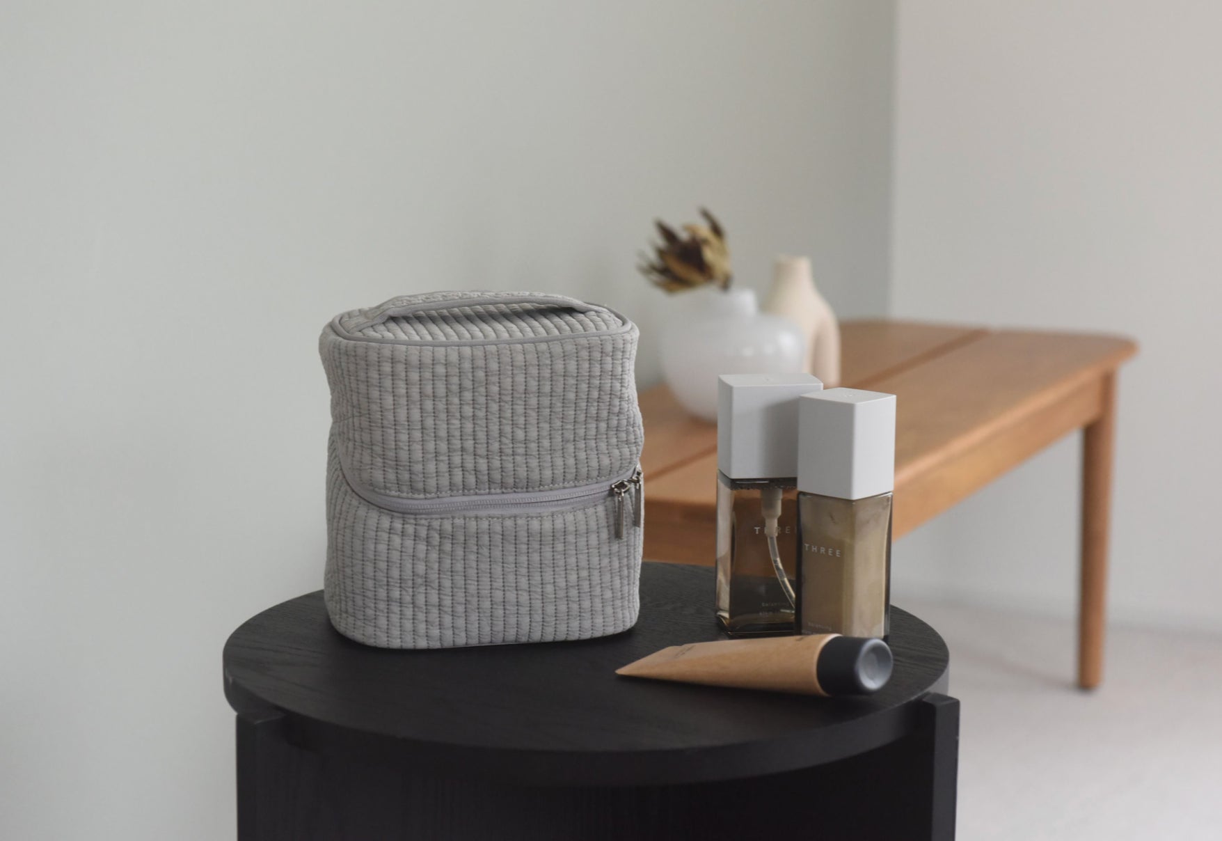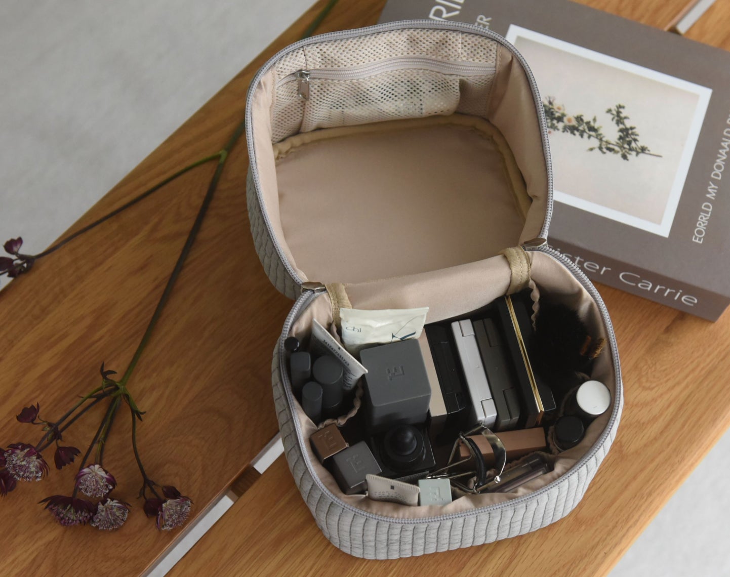 コスメはもちろん背の高い化粧水ボトルもすっぽり入る、収納力の高さが好評の bon moment(ボンモマン)バニティポーチ。収納力はそのままに、ヌビ(キルティング)素材のNEWモデルが登場します。