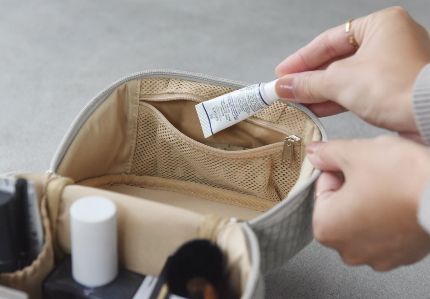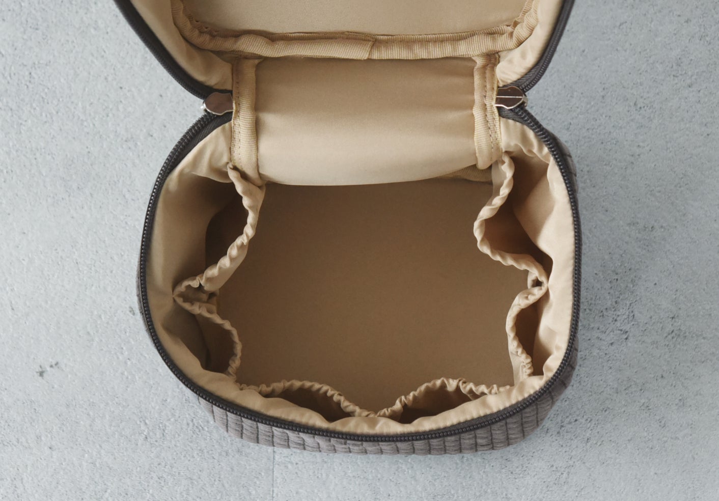 またポーチ全体にほどよい厚さのクッションを入れ、ちょっとした衝撃から化粧品を守れる仕様に。