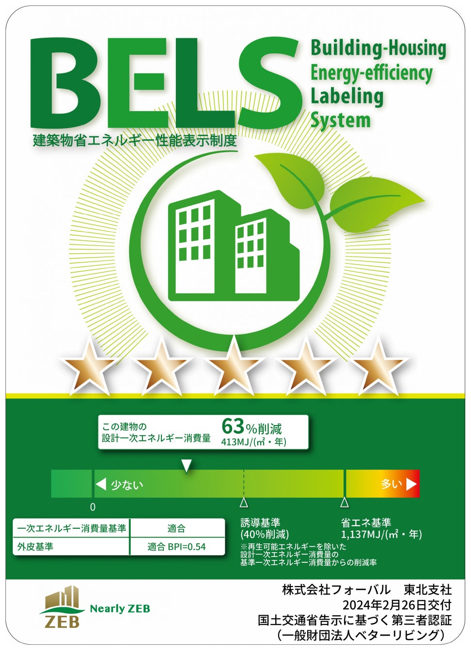 フォーバルの建築物は、第三者機関が省エネルギー性能を評価・表示する「BELS(建築物省エネルギー性能表示制度)」において、最高ランクである五つ星を取得しました。さらに、「Nearly ZEB」認証も取得しており、優れた省エネルギー性能が認められています。