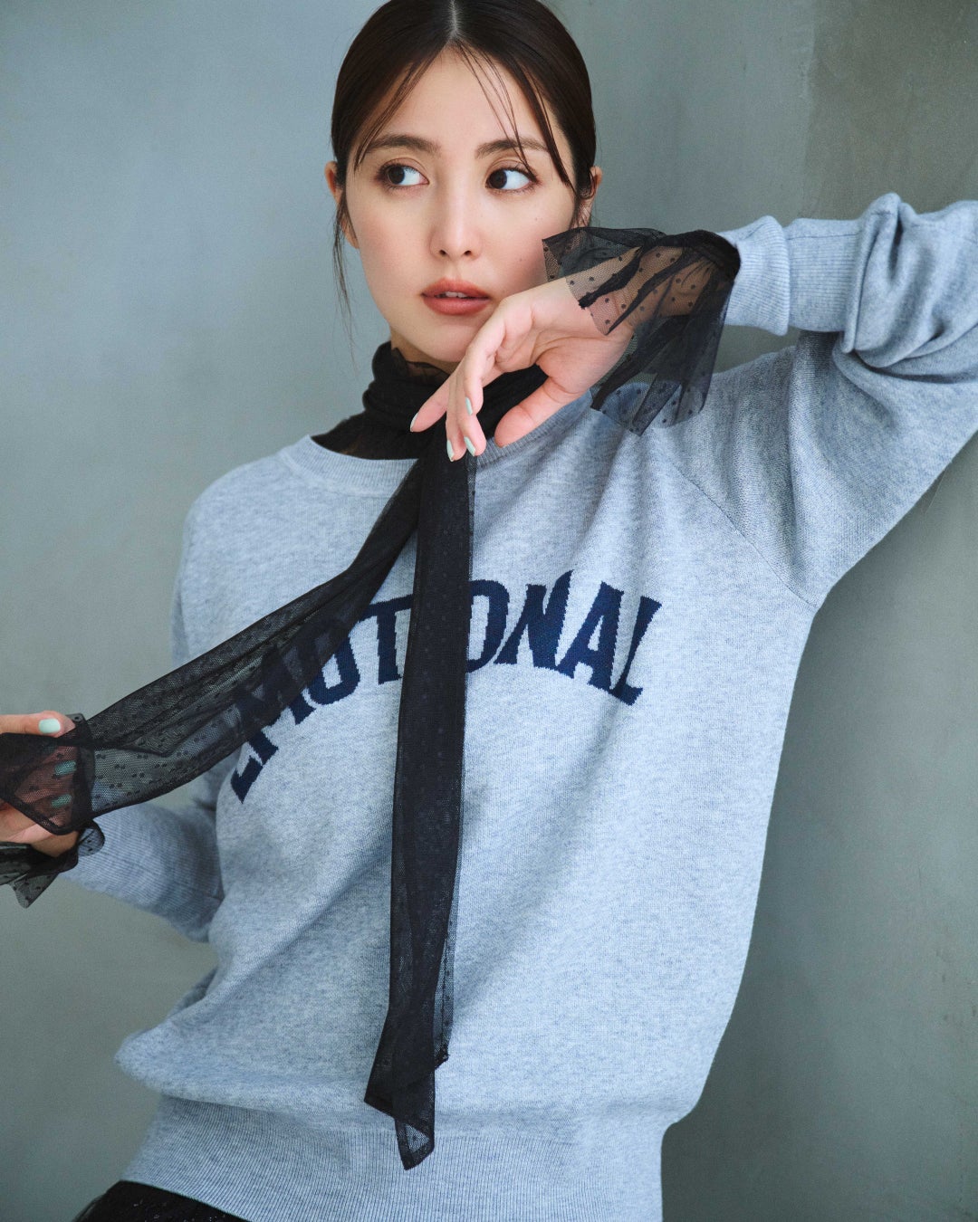 1.カジュアルなロゴニットにチュールを合わせてドレスアップ