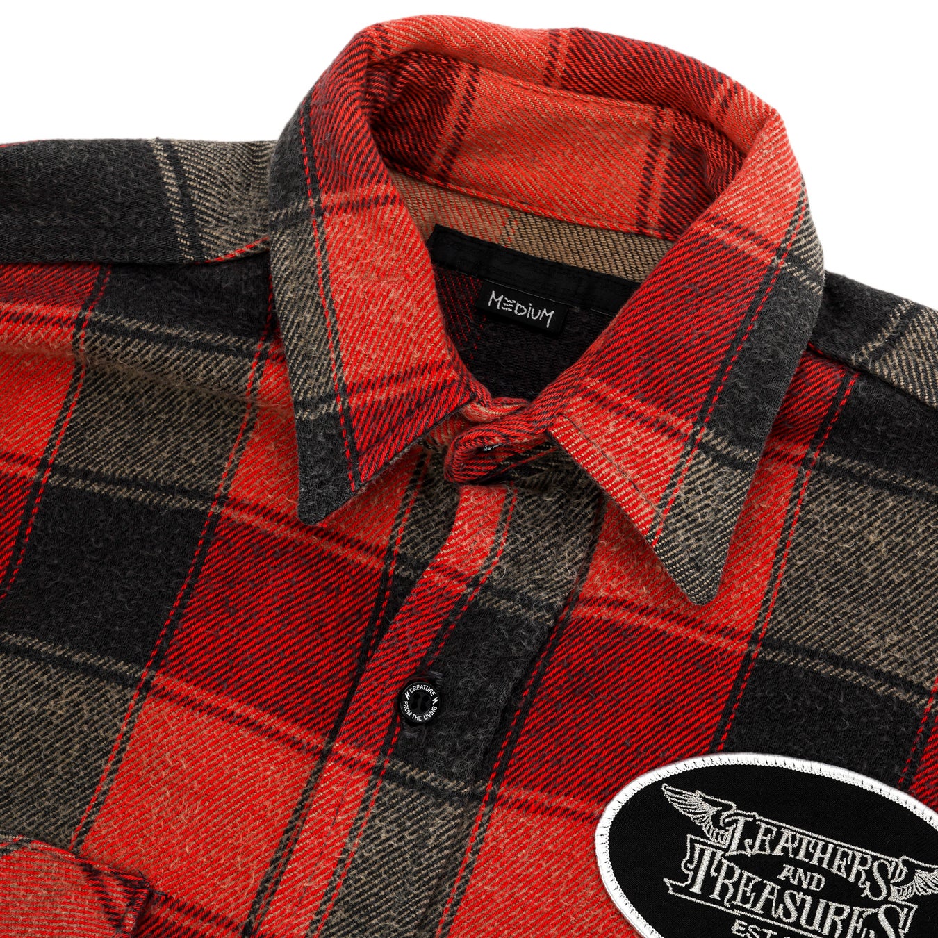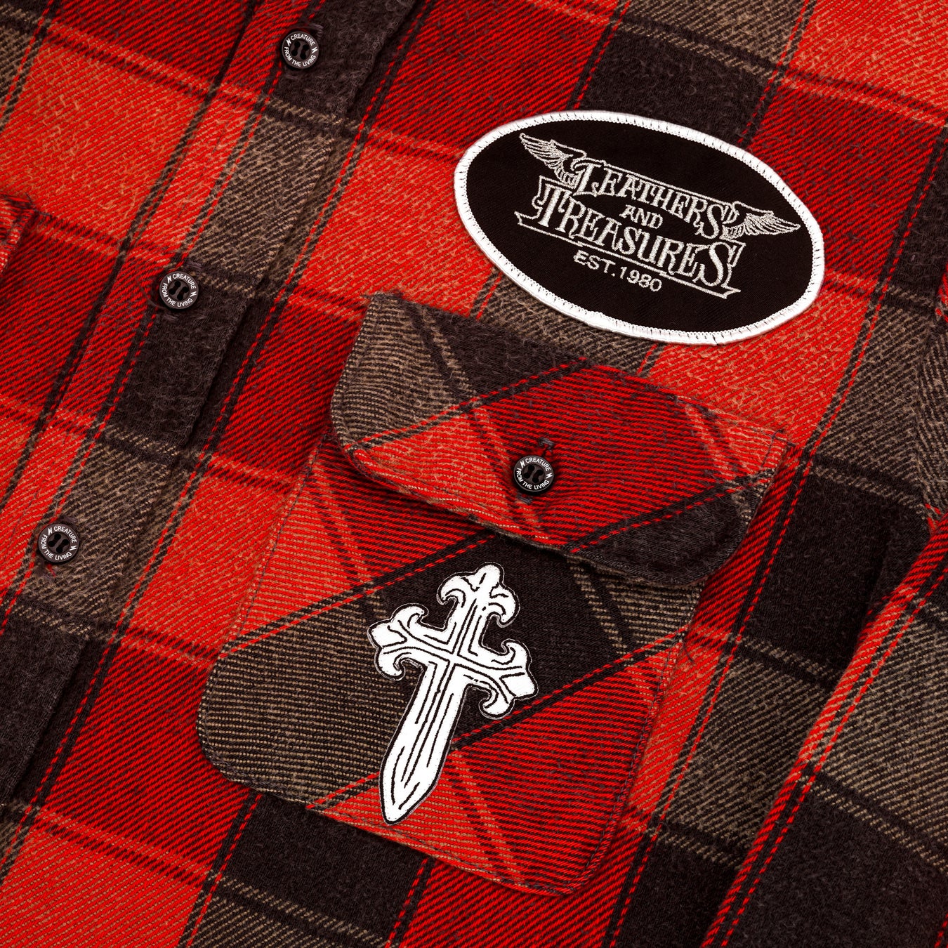 さらに、細部にまで徹底したこだわりを注入。CREATURE FROM THE LIVINGを象徴するオリジナルテープ、専用ボタン、刺繍ワッペンなどを随所に配し、量産では決して表現できないディテールワークによって、Leathers and Treasuresが掲げる哲学「God is in the details(神は細部に宿る)」を衣服という新たなフィールドで体現した作品となっています。