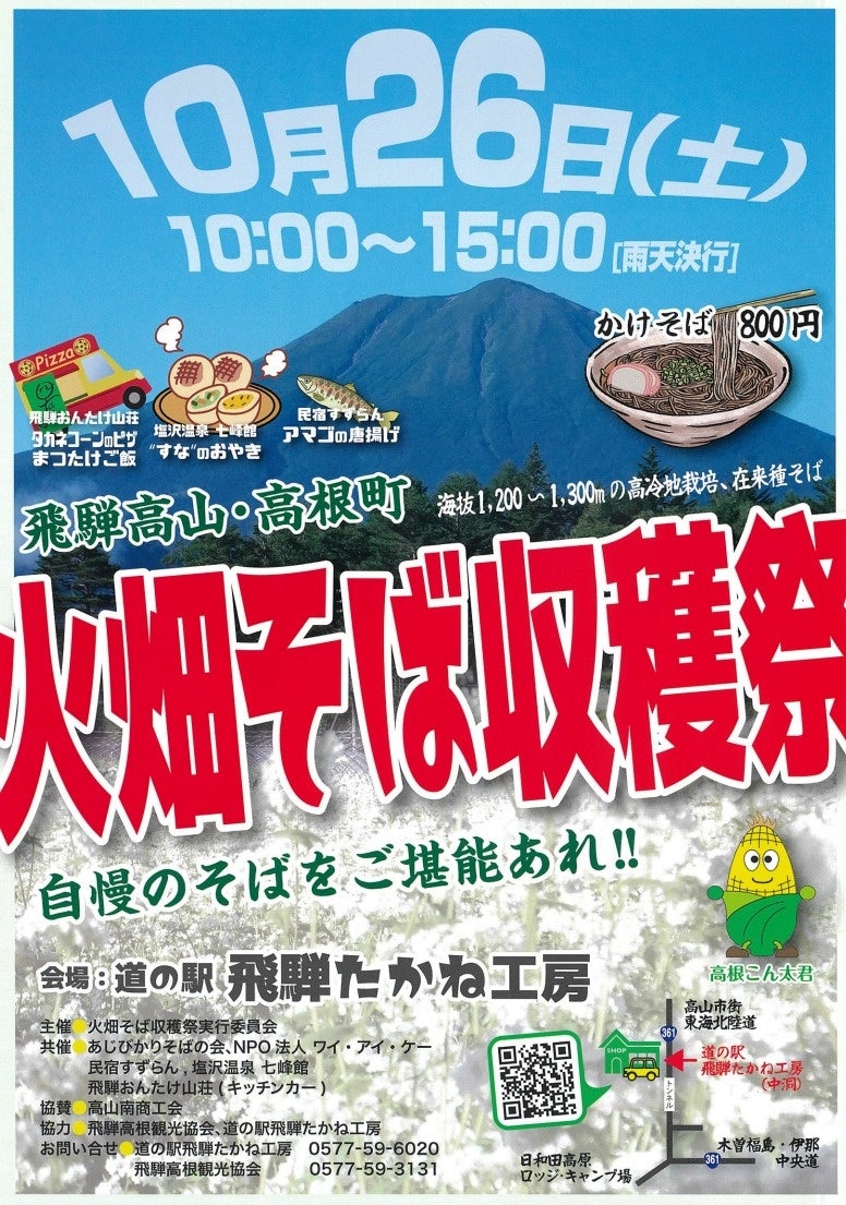 令和6年10月26日(土)に、岐阜県高山市高根町の道の駅飛騨たかね工房にて、例年好評の『火畑そば収穫祭』を開催します。香り豊かな火畑そば。挽きたての新蕎麦を「かけ蕎麦」にて800円で販売します。