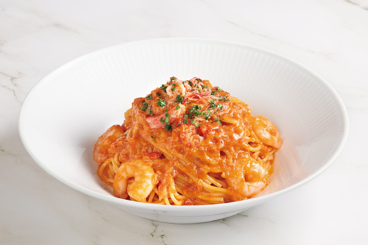 オマールの豊かな香りと美味しさが溶け出した特製ソースと紅ずわい蟹、えびが織りなす格別な味わい。濃厚な魚介の旨みが絡む、もちもち食感の生パスタをお楽しみください。