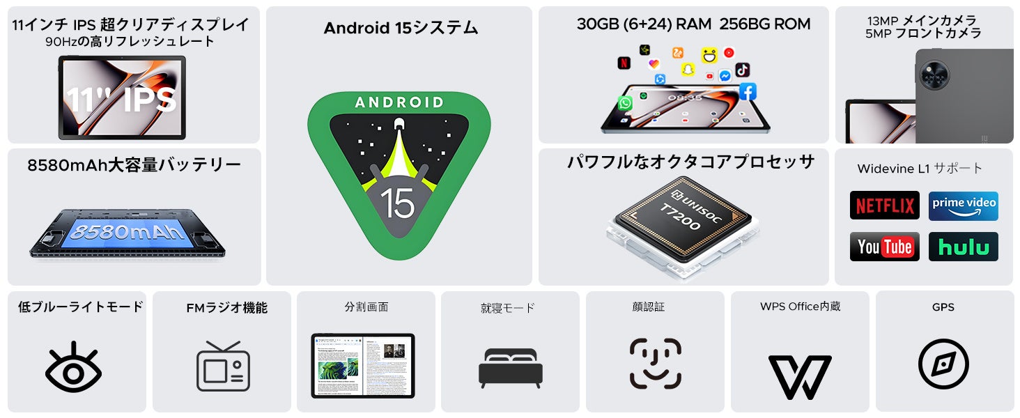 学生、ビジネス、クリエイターに最適なこのタブレットは、基本6GBのメモリを搭載し、最大30GBまで拡張可能、さらに256GBの大容量ストレージを実現。最新の【Android 15】OSにより、安全性と使いやすさが向上し、【高性能タブレット】としてマルチタスクやファイル管理がスムーズに行えます。