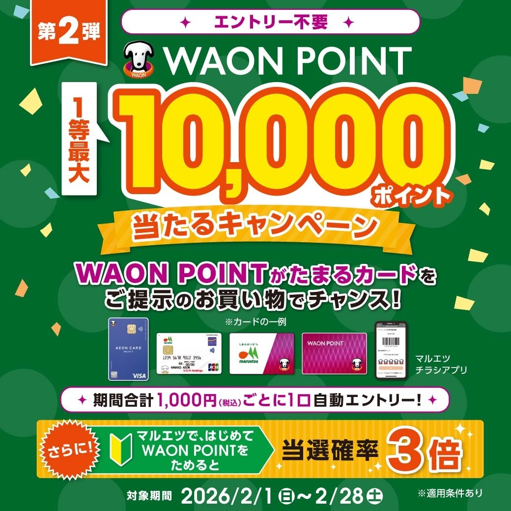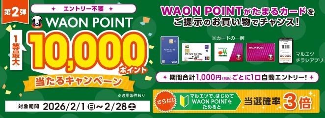 株式会社マルエツ(本社:東京都豊島区、代表取締役社長:本間 正治)は、2月1日(日)から2月28日(土)まで、WAON POINT一等最大10,000ポイントが当たるキャンペーンを実施いたします。