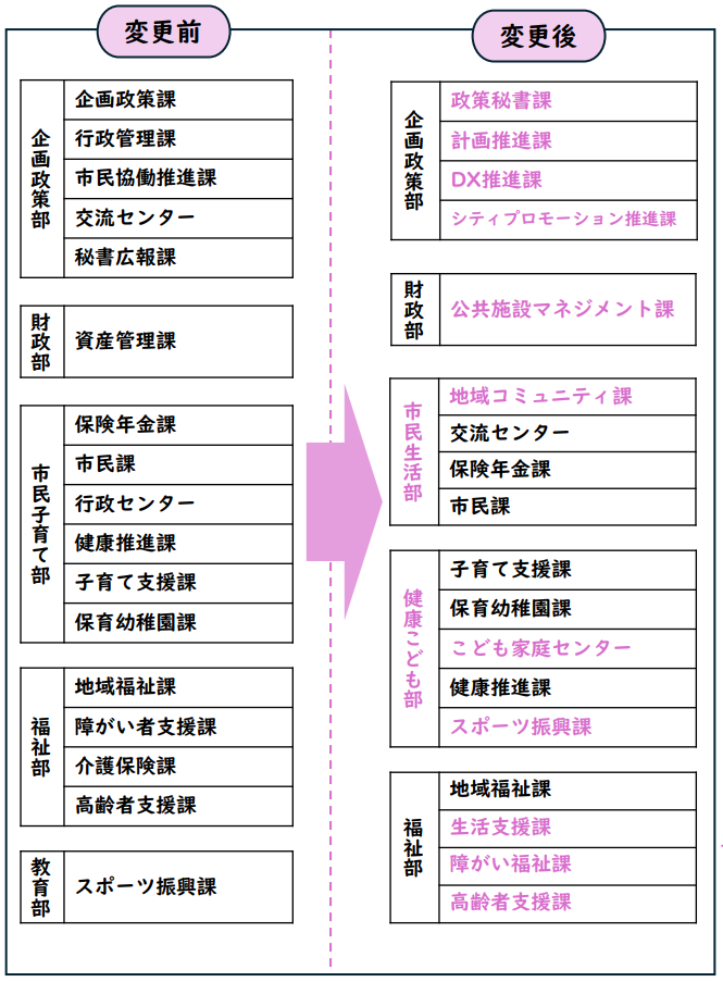 複雑化する行政課題に対応するため、令和8年4月1日に組織を見直します。「機動的な政策立案」「地域コミュニティ活性化」「子育て・健康増進」「重層的な福祉支援」の4つを柱に、市民サービスの向上を目指します