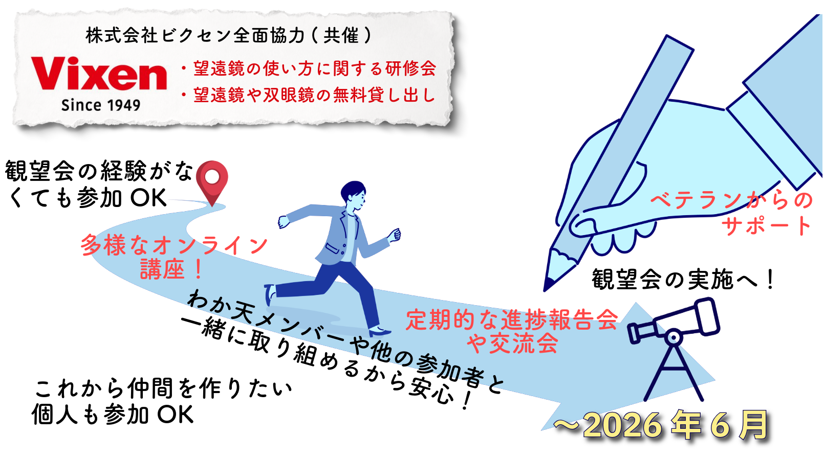 総合光学機器メーカー株式会社ビクセン(本社:埼玉県所沢市、代表取締役:新妻和重)は、「若手とつくる全国星空観望会プロジェクト」(主催:日本天文教育普及研究会 若手天文教育普及WG)を共催し、講師の派遣、機材の貸出などでサポートいたします。