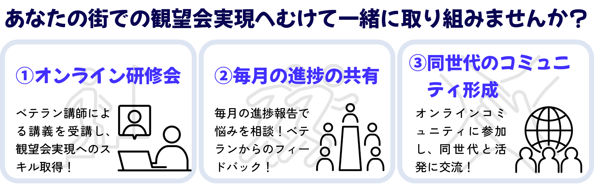 観望会づくりの基礎から安全面を考慮したイベント運営、広報を学ぶオンライン研修(全5回)を実施し、2026年6月までに星空観望会の実現を目指すプロジェクトです。
