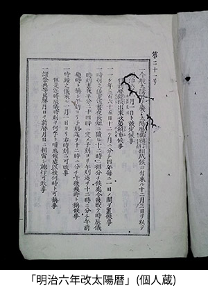 本展では、1783(明治6)年に実施された太陽暦への改暦の内容を伝えた冊子「明治六年改太陽暦」をはじめ、時の流れに関する書物を展示します。