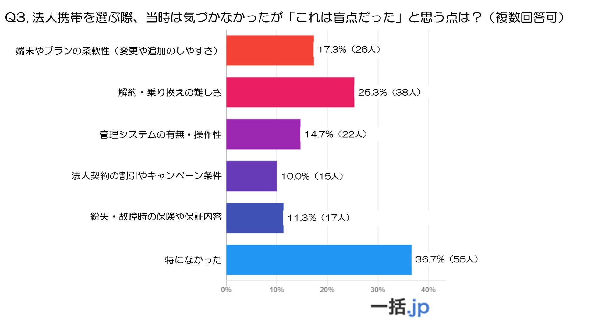 アンケート結果で最も多かった回答は「特になかった」で、36.7%(55人)でした。このことから、法人携帯を選ぶ際に、多くの企業が選択後に特段の盲点を感じていないことが分かります。