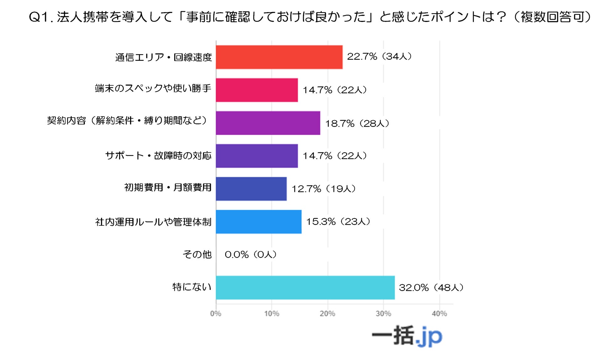 アンケート結果で最も多かった回答は「特にない」で、32.0%(48人)でした。この結果から、法人携帯導入において事前に特別な確認をしなくても問題がなかったと感じている企業が一定数存在することがわかります。