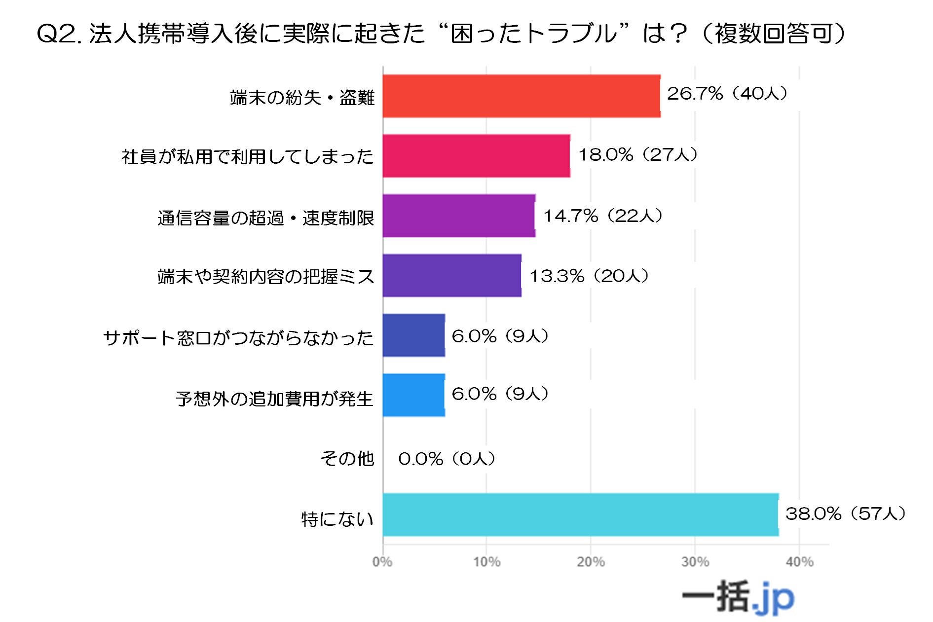 アンケート結果で最も多かった回答は「特にない」で、38.0%(57人)となりました。これは、法人携帯を導入した多くの企業で、実際には大きなトラブルや困った経験がなかったことを示しています。