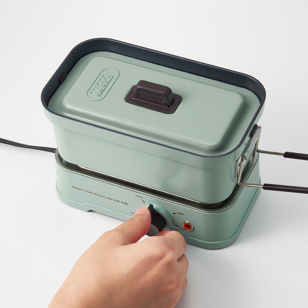 炊飯だけでなく、焼く・煮る・蒸すなどの調理ができ、『万能クッカー』と言われる“メスティン”。「Toffy ホットメスティン」は、そんなアウトドアで人気のメスティン調理がおうちで楽しめるキッチン家電です。メスティンに専用加熱台が付属し、火を使わずに食卓でも安心して調理できます。無段階の火力調節機能付きで、キャンプ調理では難しい火加減の細かな調節もお手のもの。とろ火でじっくり煮込んだり、火力を強くして炒め物など、どんなレシピも自由自在。お皿いらずでそのまま直接食べられて、余分な洗い物なしに、気軽に調理&食事ができるのも嬉しいポイントです。専用メスティンは直火でも使用できるので、おうちとアウトドア両方で楽しめます。内部はふっ素塗装でお手入れもラクラクです。ひとりご飯にも、みんなが集まるパーティーシーンでも大活躍!
