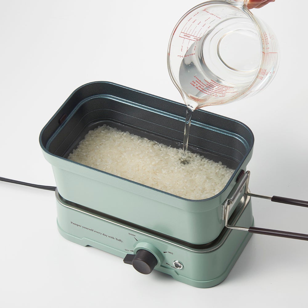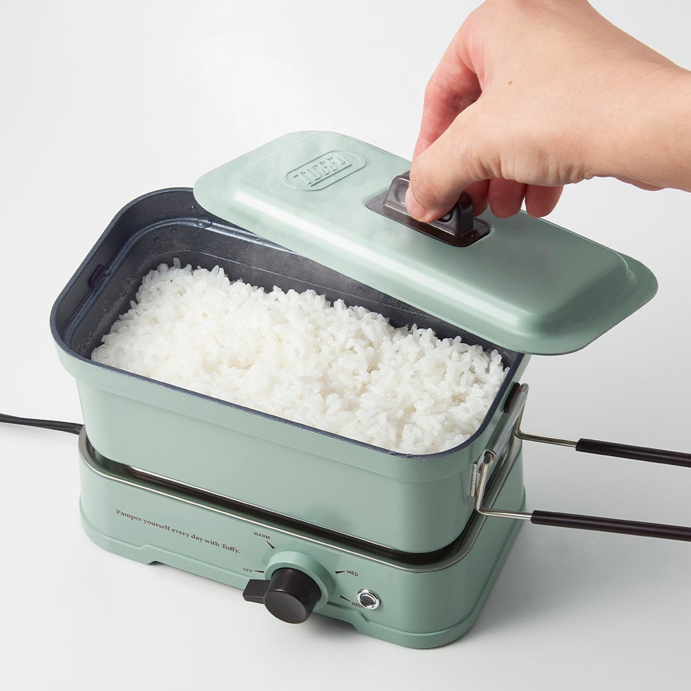 電気で調理する加熱台とセットになった「Toffy ホットメスティン」は、火を使わないのでおうちでも安心して卓上調理ができます。保温から約230℃まで、無段階の火力調節が可能です。お米は最大1.5合炊けるので、ひとりご飯にも2~3人の食卓にもぴったり!専用メスティンは水洗いができ、内部はふっ素塗装で焦げ付きにくく、お手入れも簡単です。