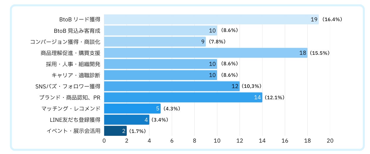 「ブランド・商品認知PR」(12.1%)と「SNSバズ」(10.3%)を合わせた認知拡大系は合計22.4%となり、「BtoBリード獲得」(16.4%)と「見込み客育成」(8.6%)を合わせたBtoB営業支援系(25.0%)とほぼ拮抗しています。診断コンテンツは、この二つの用途が中心となって活用されていることがわかります。