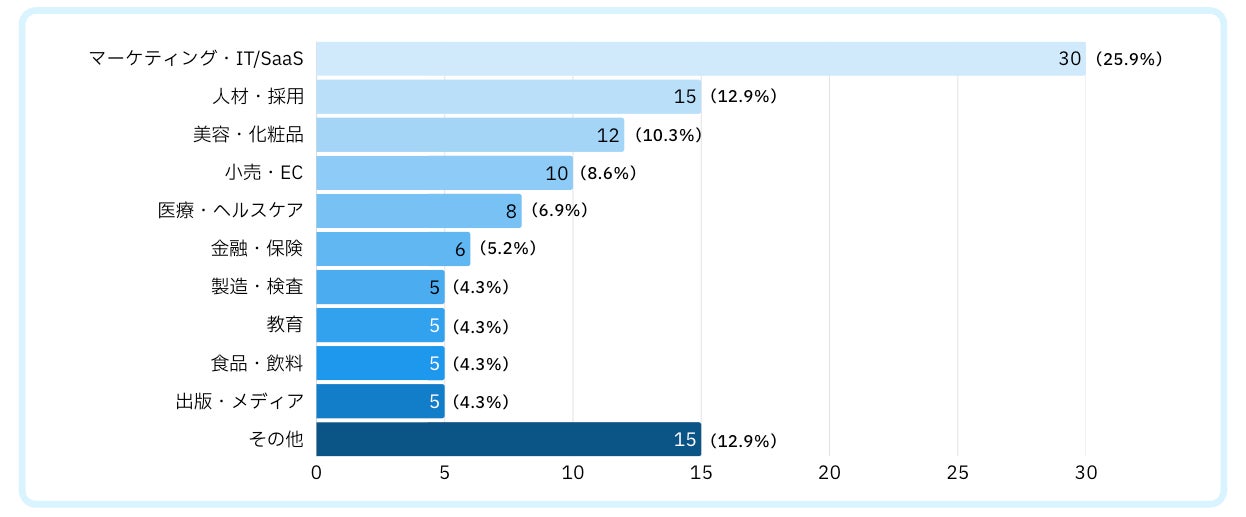人材・採用(12.9%)は適職診断との親和性が高く、美容・化粧品(10.3%)ではパーソナルカラー診断を通じてEC流入率が3倍に伸びた成果が背景にあります。
