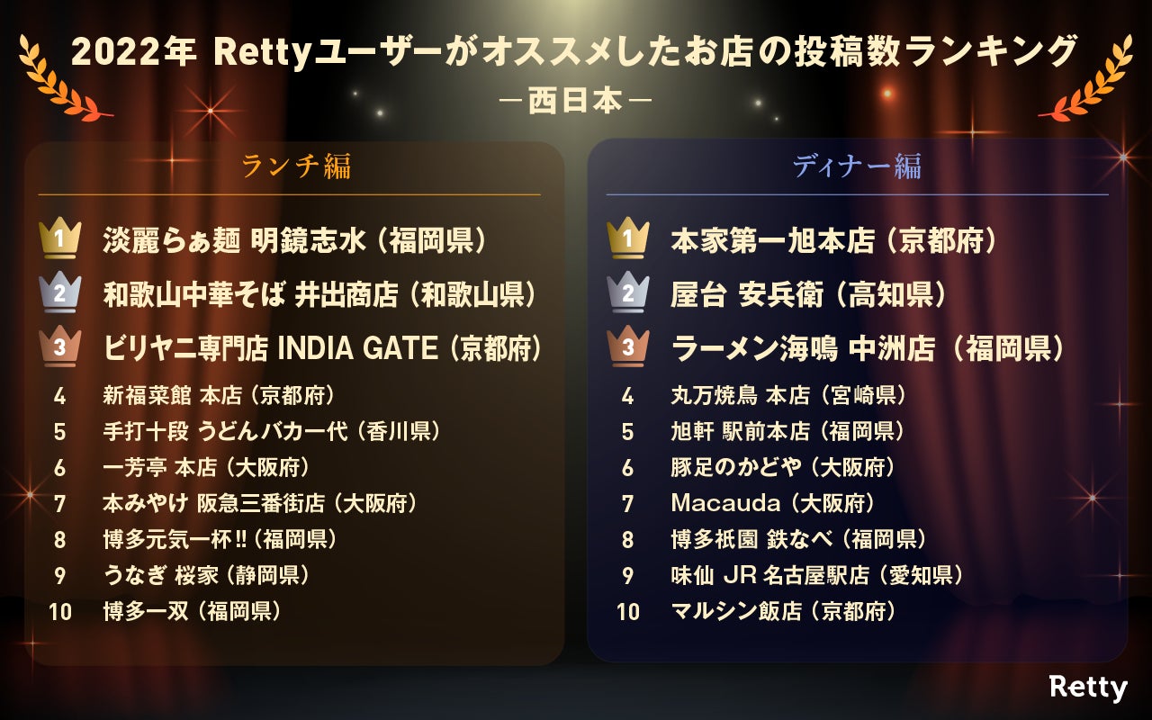 - 2022年 Rettyユーザーがオススメしたお店の投稿数ランキング ー西日本ー