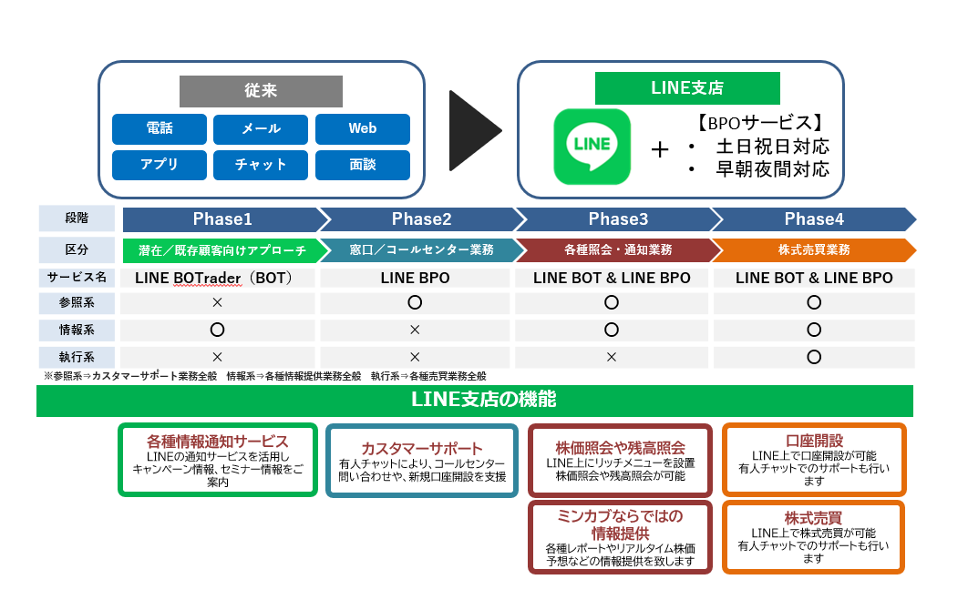 株式会社ミンカブ・ジ・インフォノイド(以下「ミンカブ」、本社:東京都千代田区、代表取締役社長 兼 CEO/CFO:瓜生 憲)は、子会社である株式会社ミンカブアセットパートナーズ(以下「ミンカブアセットパートナーズ」、本社:東京都千代田区、代表取締役社長:齋藤 正勝)を通じて、金融機関向けにLINE支店構築サービスの提供を開始いたしましたのでお知らせいたします。