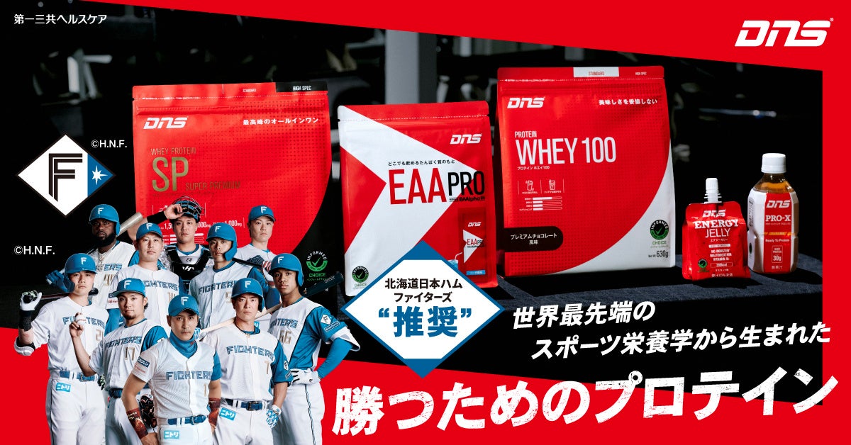第一三共ヘルスケア株式会社(本社:東京都中央区)が展開するスポーツサプリメントブランド「DNS(ディーエヌエス)」は、2025年6月26日(木)より展開中のブランドキャンペーン「GET THE WIN DNS」に続く活動の一環として、北海道日本ハムファイターズより「推奨プロテイン」として認定されたことをお知らせします。DNSの世界基準の品質と、“勝ちにこだわる”アスリートのためのプロテイン、サプリメントであるというメッセージを、より多くの方々に届けてまいります。