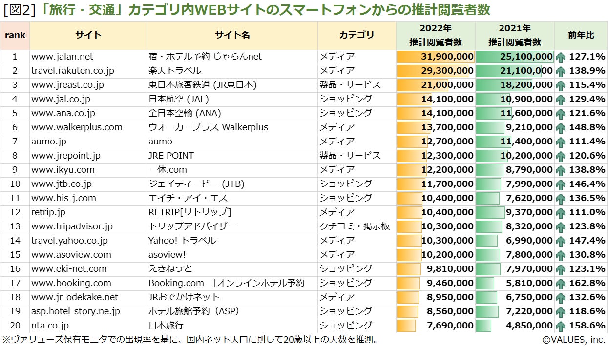ヴァリューズが独自に定義する「旅行・交通」カテゴリのサイトについて、2022年の1年間における閲覧人数を集計したところ[図1] [図2]、PCでは大半、スマートフォンでは全てのサイトが、前年比110%以上となりました。ランキング上位にある「じゃらんnet」(前年比PC109.0%・スマートフォン127.1%)、「楽天トラベル」(PC114.6%、スマートフォン138.9%)といった個人旅行を中心としたオンライン旅行会社に加え、「日本旅行」(PC157.8%、スマートフォン158.6%)、「JTB」(PC133.6%、スマートフォン146.4%)などオンラインに加え店舗を有する旅行会社についても推計閲覧者数は前年から回復傾向にあり、旅行会社サイトの推計閲覧者数は全般的に回復傾向にあります。