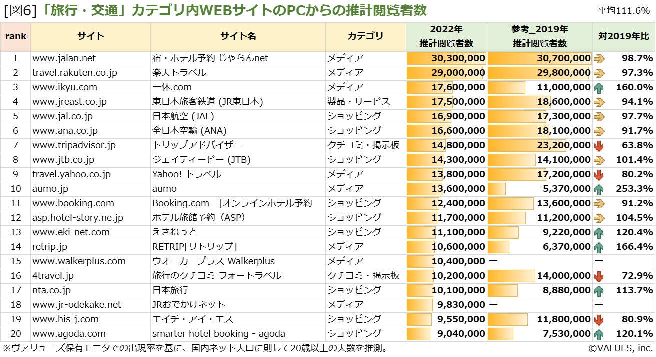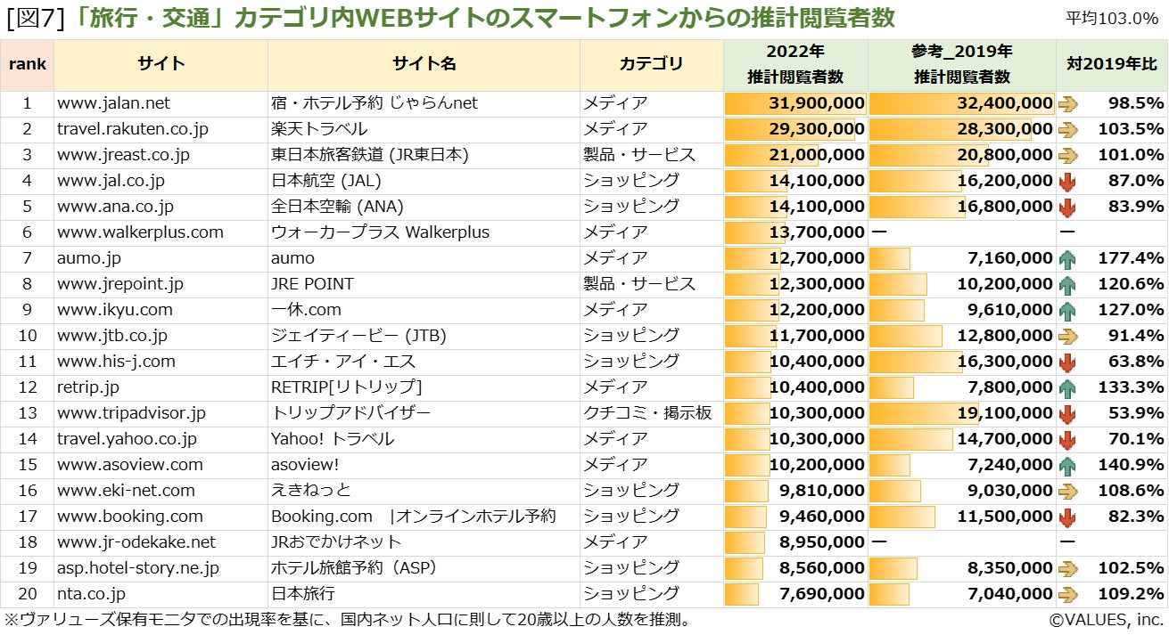 コロナ禍前(2019年)との推計閲覧者数を比較すると、旅行・交通カテゴリの上位サイトは、平均するとPCでは1.1倍、スマートフォンでは横ばいとなっており、サイトにより多少の増減はありますが、概ねコロナ前に戻りつつあると言えそうです([図6] [図7])。