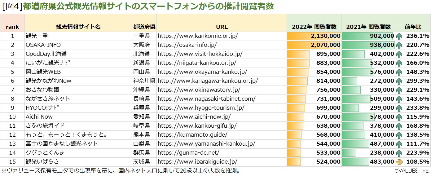 PCでは2021年と同様、1位は大阪府「OSAKA-INFO」、2位は三重県「観光三重」となっており、スマートフォンにおいては2021年と首位が逆転し、1位が三重県「観光三重」、2位が大阪府「OSAKA-INFO」となりました。