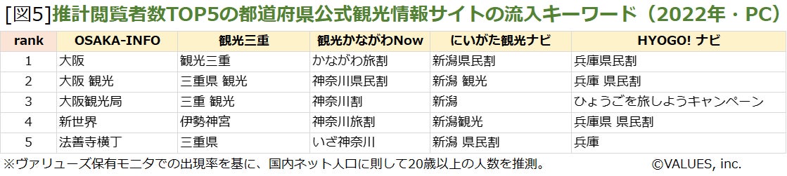 | 【調査・分析概要】 全国のヴァリューズモニター(20歳以上男女)の協力により、ヴァリューズが独自に定義する「旅行・交通」カテゴリのWebサイトおよび各都道府県公式観光情報サイトについて、2022年と2021年の年間推計閲覧者数を集計し比較を行った。さらに、2022年の1年間において、PCにて推計閲覧者が多かった都道府県公式観光情報サイトへの流入ワードを集計した。 ※ランキング表内の「カテゴリ」はヴァリューズが独自に定義している。 ※サイト推計閲覧者数や推計検索者数はPCおよびスマートフォンからのアクセスを集計し、ヴァリューズが保有するモニタ内での出現率を基に、国内ネット人口に則して20歳以上の動向を推測した。 ※一部の各都道府県公式観光情報サイトについては、リニューアル等に伴い、2022年と2021年でサイト名称やURLが変更されている場合があるが、2022年現在のサイト名称を掲載した。 |