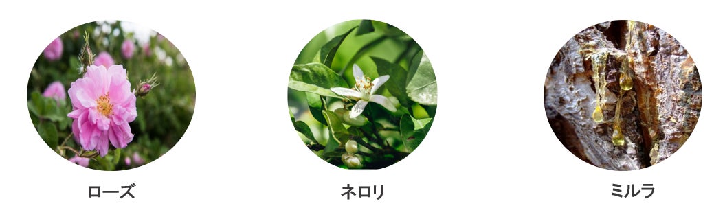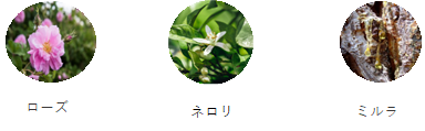 ローズ、ネロリ、ミルラをはじめとする天然精油をブレンド。