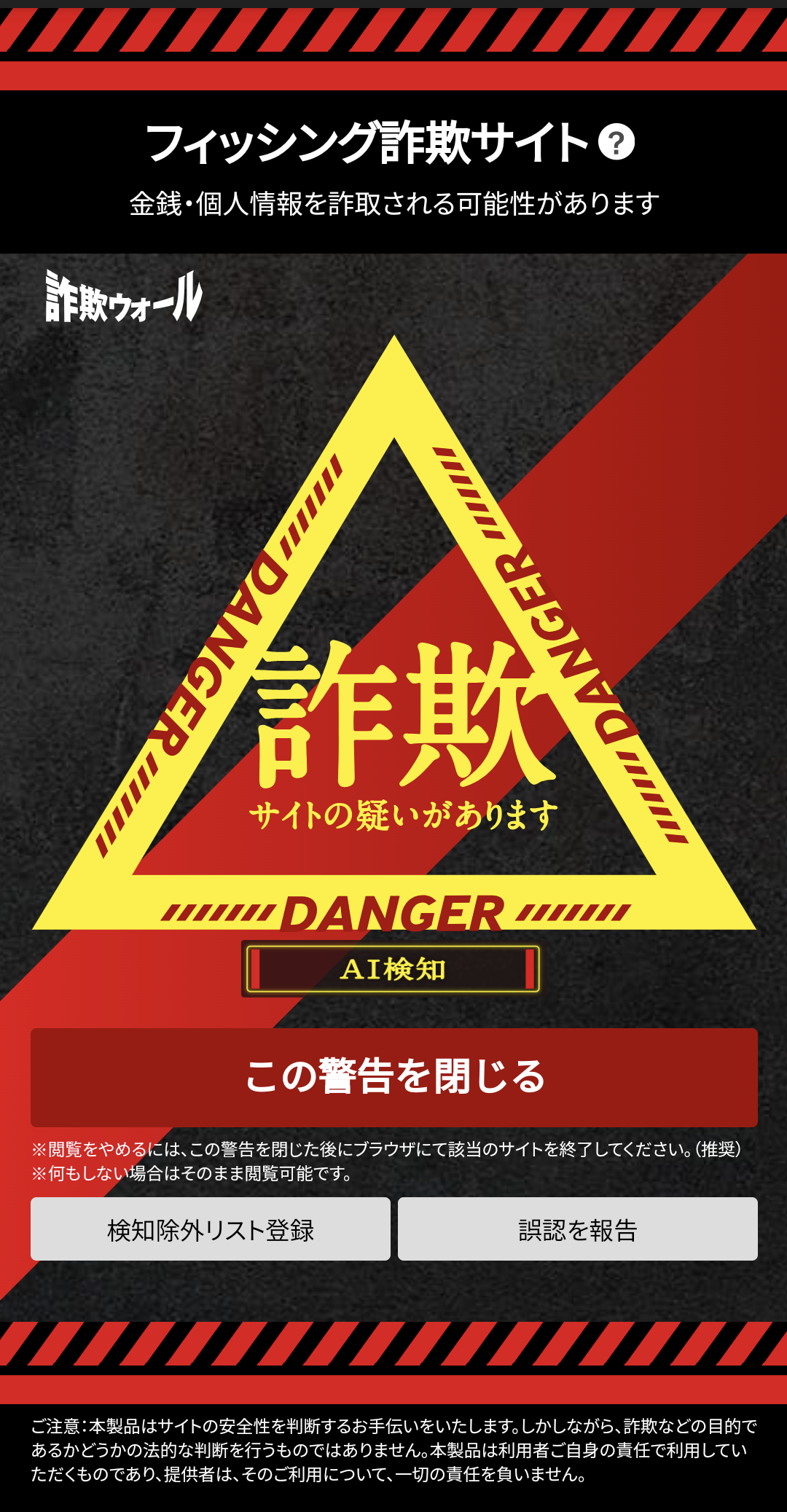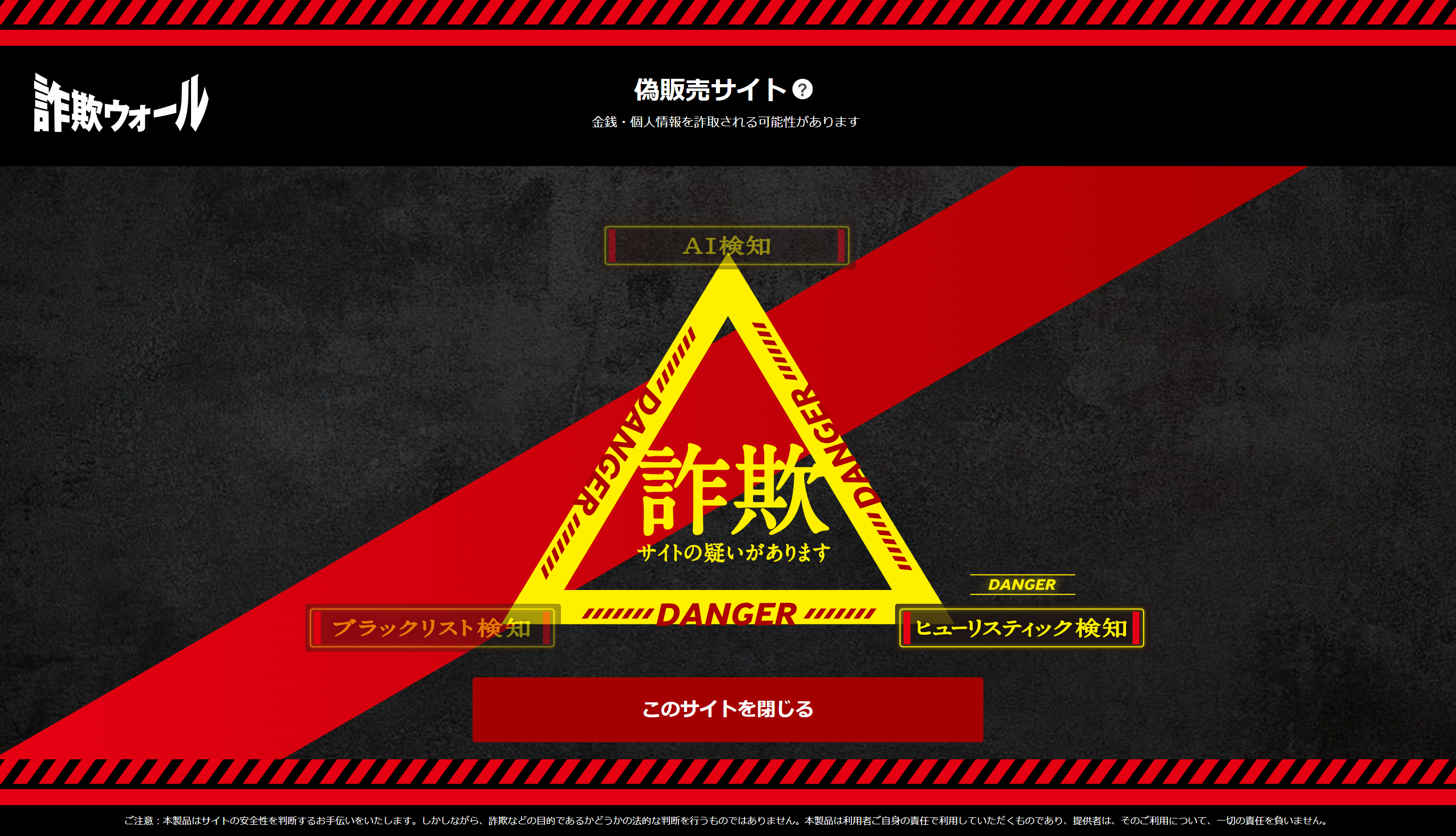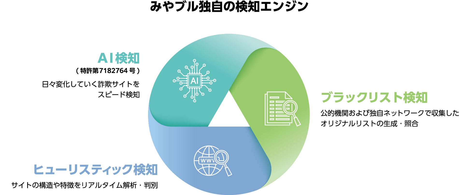 「ブラックリスト検知」「ヒューリスティック検知」「AI検知」の3つの検知方法からなる独自の検知エンジンを搭載し、日々進化する詐欺・危険サイトへの迅速な対応を可能にしています。