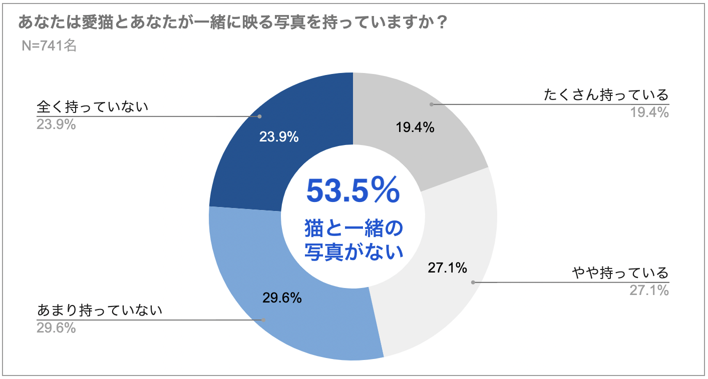 しかし、猫と暮らす人に「猫と一緒に写る家族写真」があるかを尋ねると、半数以上が「持っていない」と回答。さらにおよそ4人に1人は「全く持っていない」ことがわかりました。