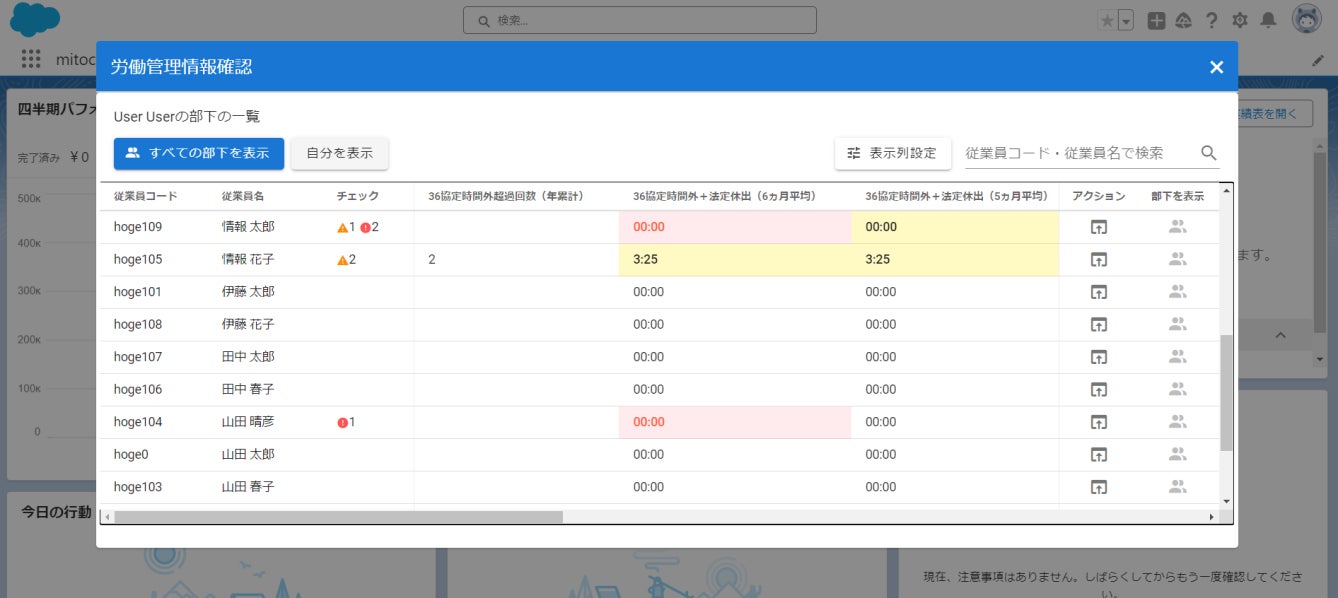 労働管理情報確認画面の一覧にチェックの列が追加され、従業員ごとにアラートの個数が表示されるようになりました。これにより、どの従業員にアラートが出ているかが分かりやすくなります。