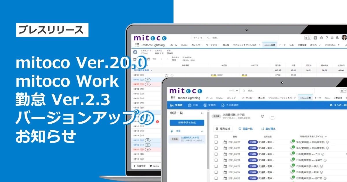 株式会社テラスカイ(本社:東京都中央区 代表取締役CEO 社長執行役員:佐藤 秀哉、以下テラスカイ)は、2024年9月11日(水)にSalesforceと連携するコミュニケーションツール「mitoco」をVer.20.0に、クラウド型勤怠管理アプリケーション「mitoco Work 勤怠」をVer.2.3にバージョンアップいたしました。