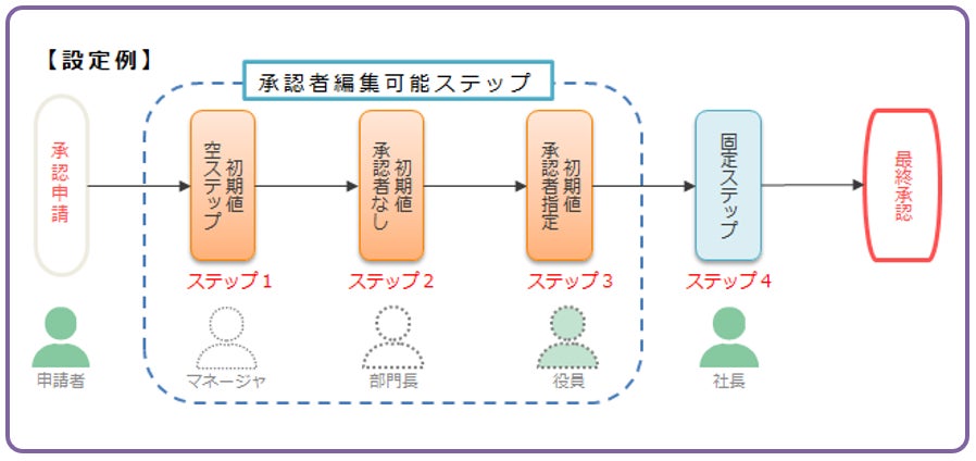 あらかじめ承認ルートを設定できない場合には、承認者編集可能ステップを設定し、申請者に承認者を指定させることができます。 |