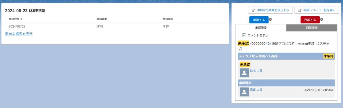 申請時にmitoco 申請の承認プロセスを選択できるほか、申請情報欄からワンクリックでページ遷移し、mitoco 申請での承認状況を確認できるようになります。
