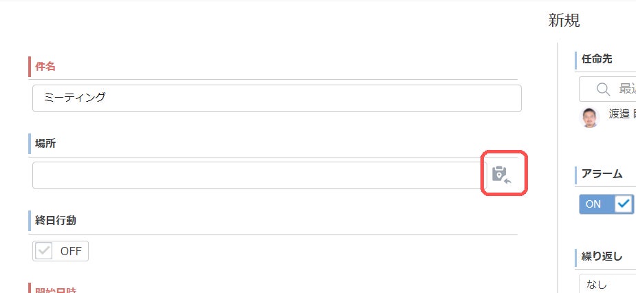 予定の作成、編集時に選択している施設の名称を[場所]項目に転記できるボタンが追加されました。