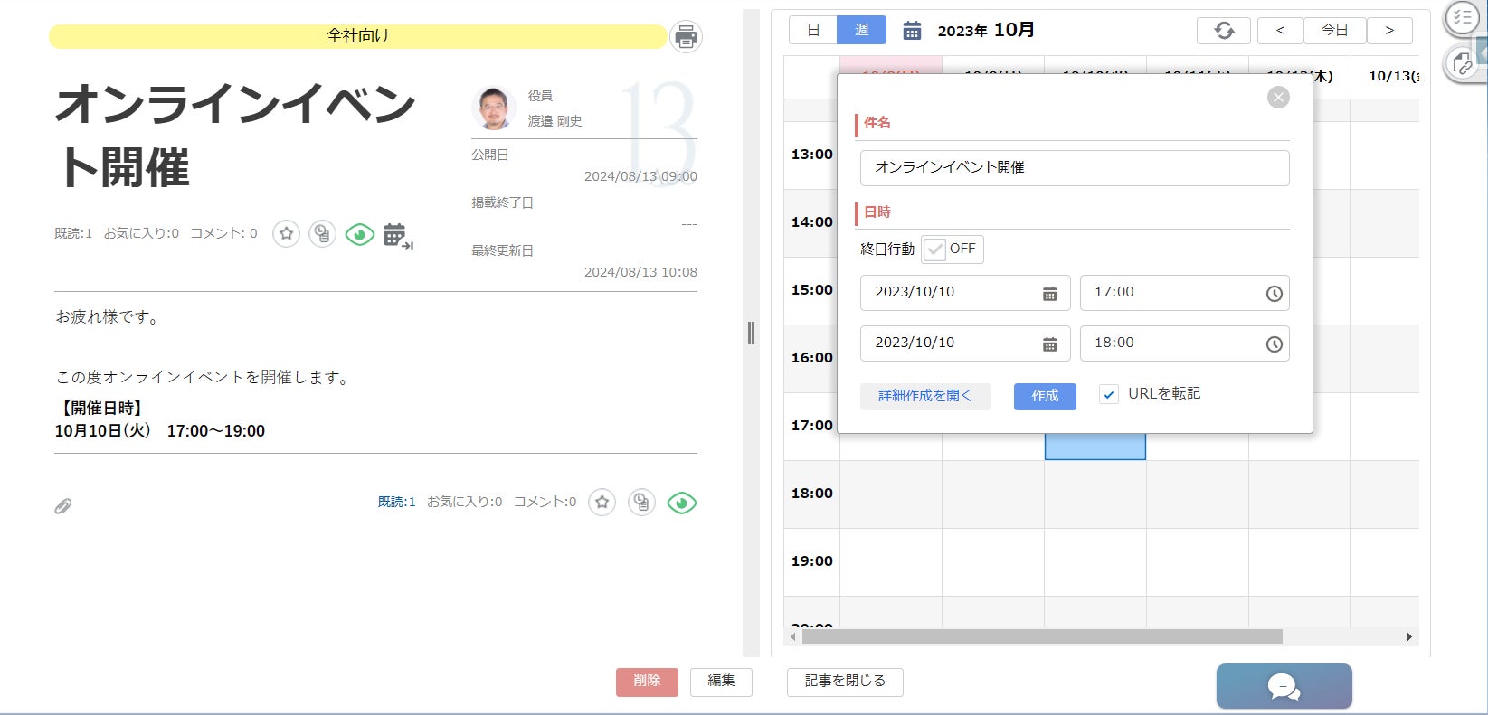 [URLを転記]にチェックして保存することで予定の[説明]に掲示詳細のリンクが設定されます。