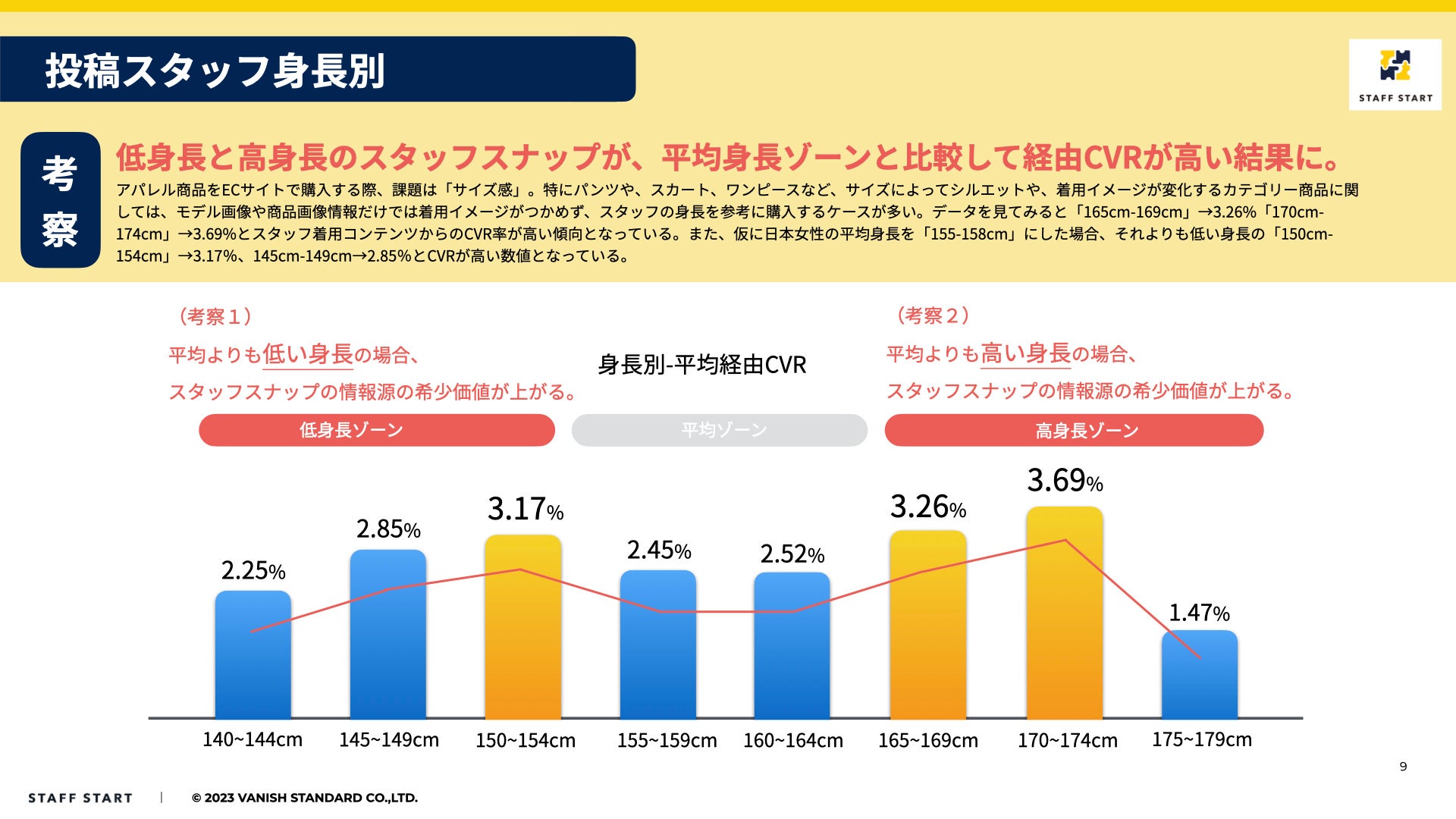 スタッフを身長別で分けると、成人女性の平均身長である158cm前後のCVRよりも、5cm以上離れた身長のスタッフの方がCVRが高い結果になりました。一般消費者アンケートの結果で「自分と似た体型のスタッフ」のスナップを参考にする人が最も多いことから、平均身長より少し離れた身長の人ほど、購入の意思決定にスタッフのスナップを参考にしていることがわかります。