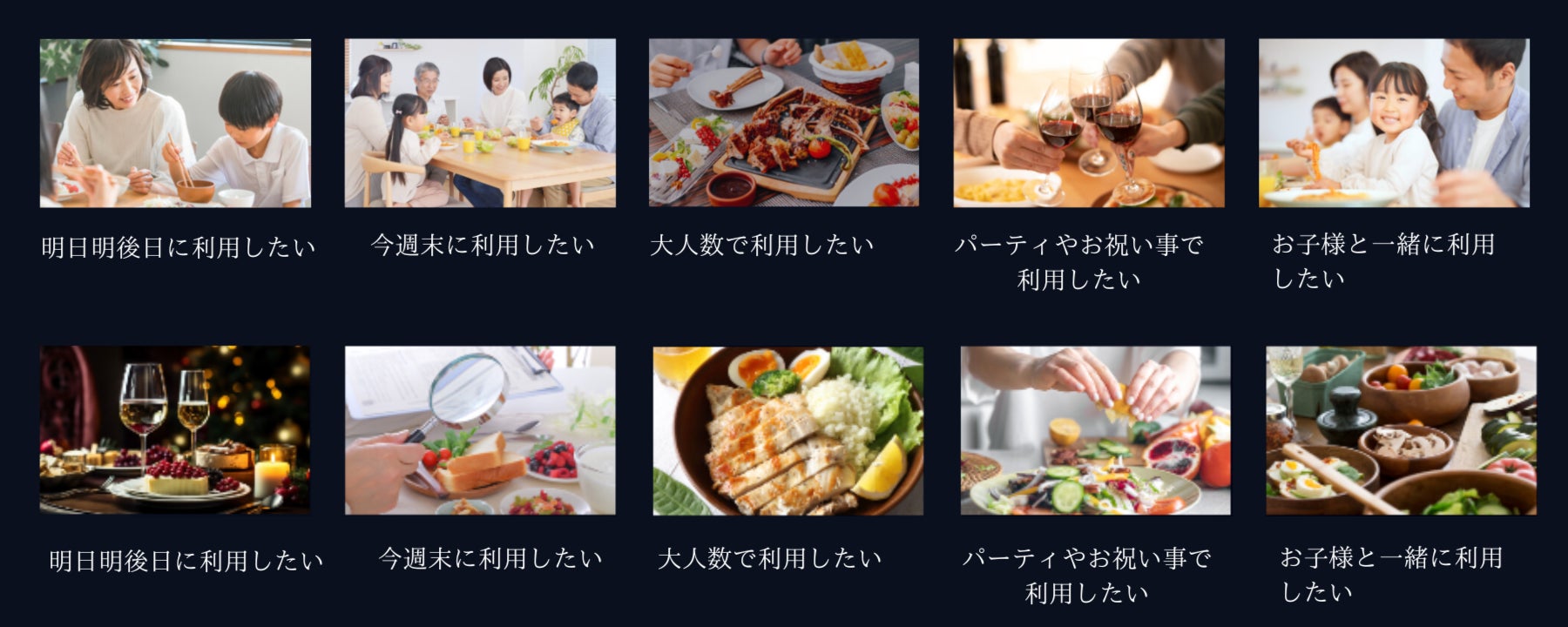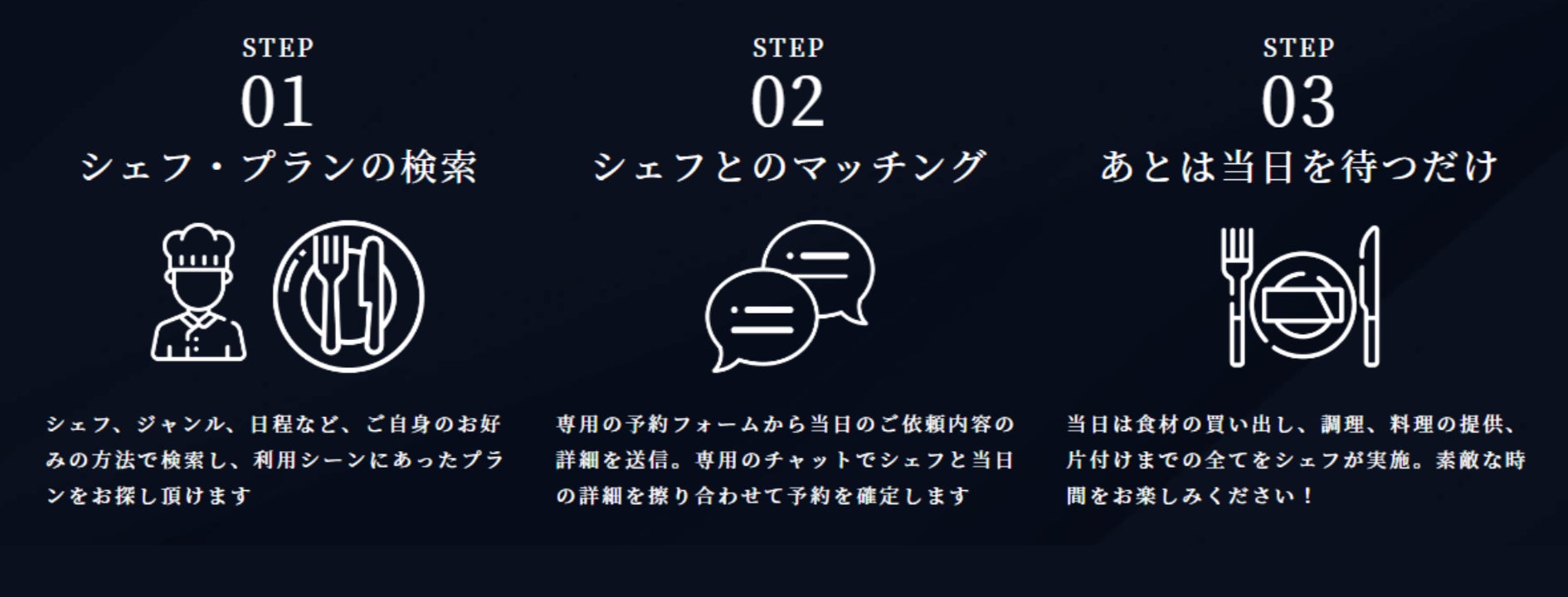 プロのシェフと一般のご家庭のマッチングサイトです。サイト上でシェフ一覧、シェフのおすすめプラン、利用シーンから、利用者はお好みのプランを選択することが可能です。