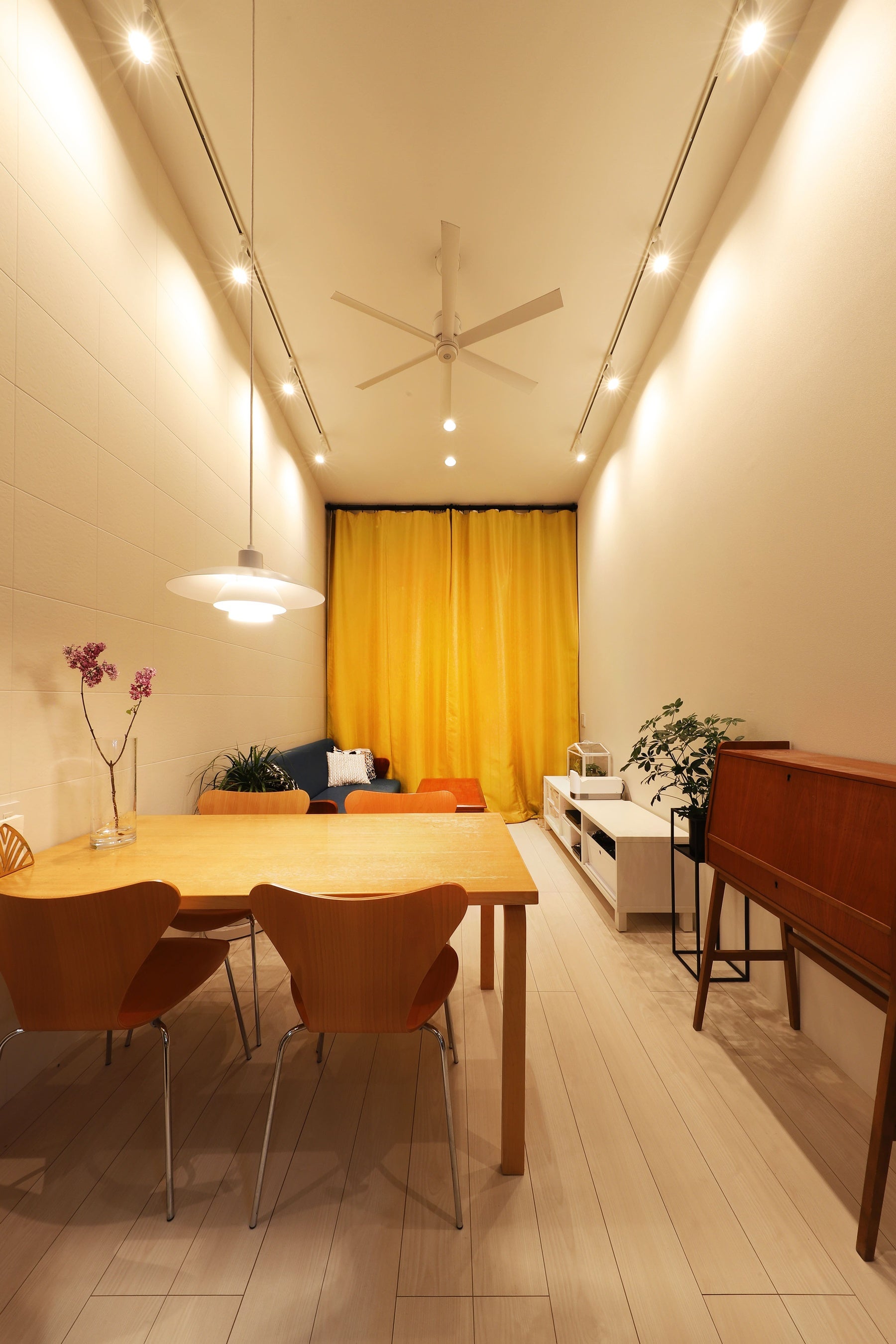 第43条但し書き道路に面し、建築審査会の同意によって許可された狭小住宅の計画です。一般的な法規制よりも更に厳しい高さ・斜線条件をクリアしながら、幅3.6mの極端に細長い敷地に対して建築可能な間口は「1間半に満たない」という厳しい建築制限の中で最大気積を確保しコートヤードを併せ持つ親子3人の為の豊かな住空間を創造しました。