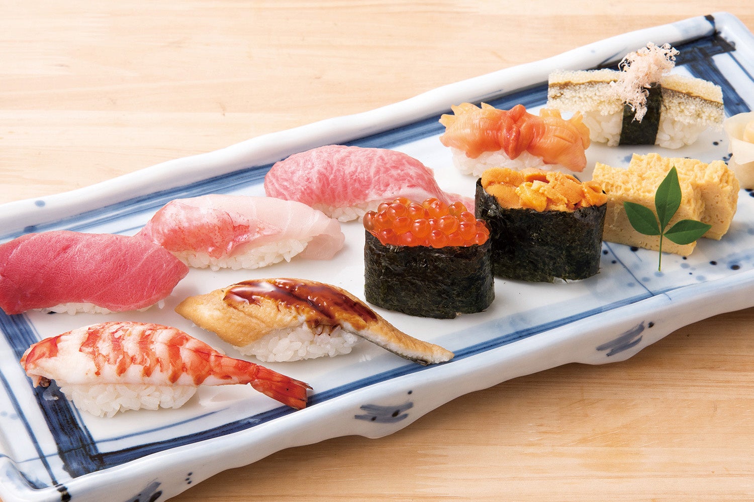 鮮魚盛り合わせは「五点盛り」(950円/1人前)、「八点盛り」(1,350円/1人前)、「十点盛り」(1,650円/1人前)を用意。それぞれ、注文するとお値段据え置きで本日の鮮魚から2点おまけが付く、嬉しいお得なメニューです。炭火で直火焼きする「炉端焼き」は、「大海老いしる醤油焼き」(1,400円/1尾)や「のどぐろ塩焼き」(時価)などの魚介をはじめ、「牛たん焼き」(1,080円)、「アスパラ岩塩焼き」(580円/2本)など肉や野菜もラインナップしています。〆には、本格的な江戸前の握り寿司はいかがでしょう。特に、国産生本鮪の大トロが入った「特上寿司盛り合わせ」(2,700円/9貫)がオススメです。