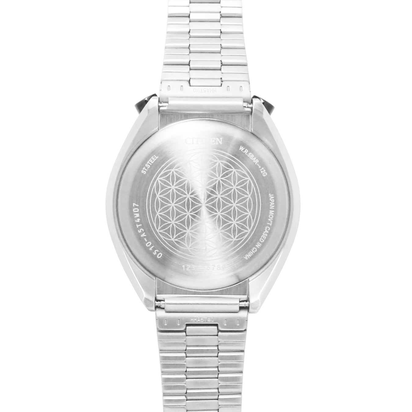 1973年に発表されたシチズン初の本格的クロノグラフ機能付き時計正式名称「クロノグラフ チャレンジタイマー」、愛称「ツノクロノ」。発売当初から、個性的デザインと機能性で人気を博し、いくつかのバリエーションが存在していましたが、JAM HOME MADEは、70’sセカンドモデルにあたる、通称「オクタゴン」の「パンダ」に注目しました。70’sファーストモデルとの違いは、本体ケースが、丸みある曲線から八角形(オクタゴン)に見える直線的に、タキメーター表記の追加と、パンダを連想させる白黒のカラーリング。ブラックベゼルも本体のシルバーと同色に統一され、レトロフューチャーは健在しつつもさらにアップデートした印象を与える製品です。70’sセカンドモデル、通称「オクタゴン」の「パンダ」を限りなくイメージしながら、ツノ部分と、ベルトバックル部を黒に特色する事で、さらにパンダに近づけ、ケースのオクタゴン形状は、70’sファーストの丸みある曲線は残し、裏蓋に神聖幾何学模様の「フラワーオブライフ」を刻印しました。生命の根源といわれる力の模様「フラワーオブライフ」を裏蓋に刻印することで、腕に触れている模様から、未知なる力でエネルギーが得られるように願いを込めています。