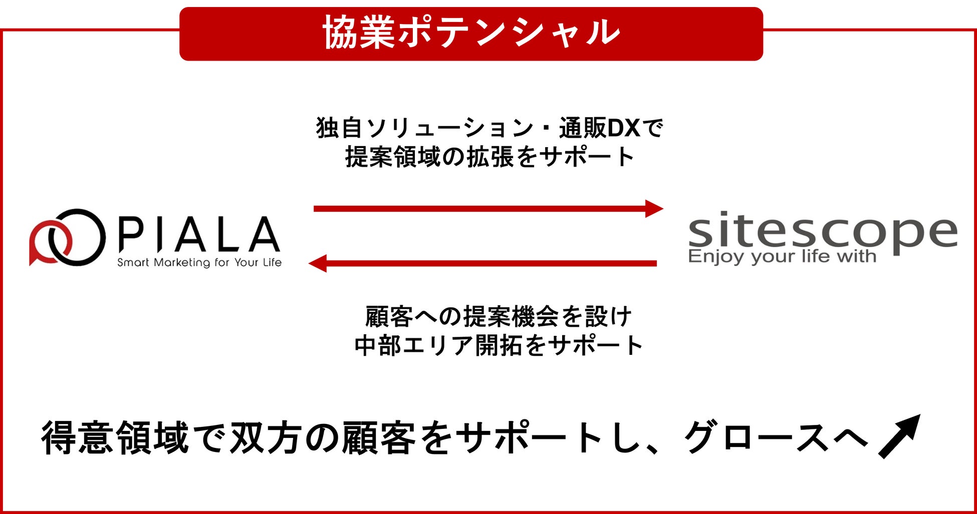 また、この度の資本業務提携によって、サイトスコープが18年間築き上げてきた顧客基盤へ、当社の独自ソリューションや通販DXサービスの提案機会をいただくことが可能になります。当社はサイトスコープ側から中部エリアでの顧客開拓のサポートを受けると共に、当社のパートナーとして、サイトスコープの持つサービスや運用能力と連携していくことで、双方の成長拡大に努めてまいります。